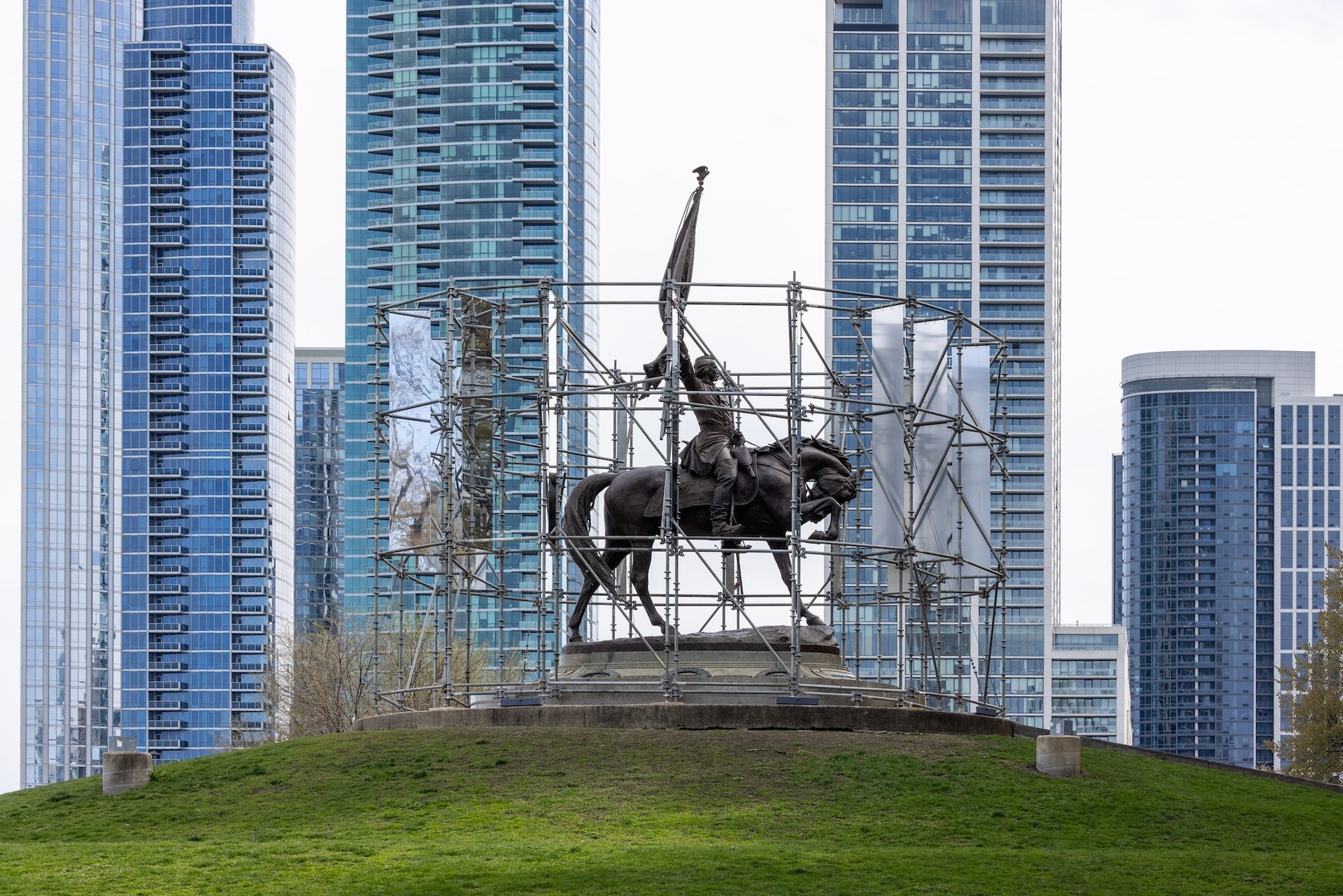 Brendan Fernandes, New Monuments | Chicago, 2024. General John Alexander Logan Monument, Grant Park, Chicago. Presented by Black Cube Nomadic Art Museum in association with the Chicago Park District, as part of Expo Chicago’s In Situ Outside program. Architectural intervention by AIM Architecture. Courtesy the artist and Black Cube Nomadic Art Museum. Photo: Matthew Reeves Photography.