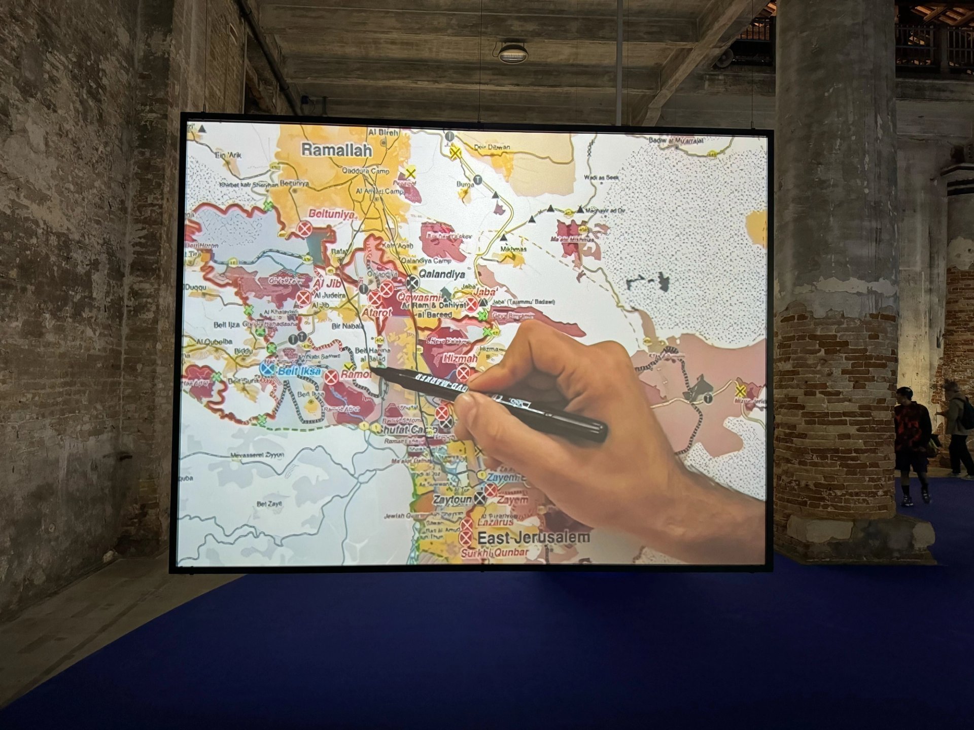 Palestine is also referenced in the Arsenale with Bouchre Khalil’s video collection, The Mapping Journey Project (2008-11), in which people forced to cross borders illegally illustrate the routes that they took. One of eight videos playing simultaneously shows a young Palestinian man mapping out the convoluted way he travels from Ramallah to East Jerusalem, keeping Israeli checkpoints in mind.