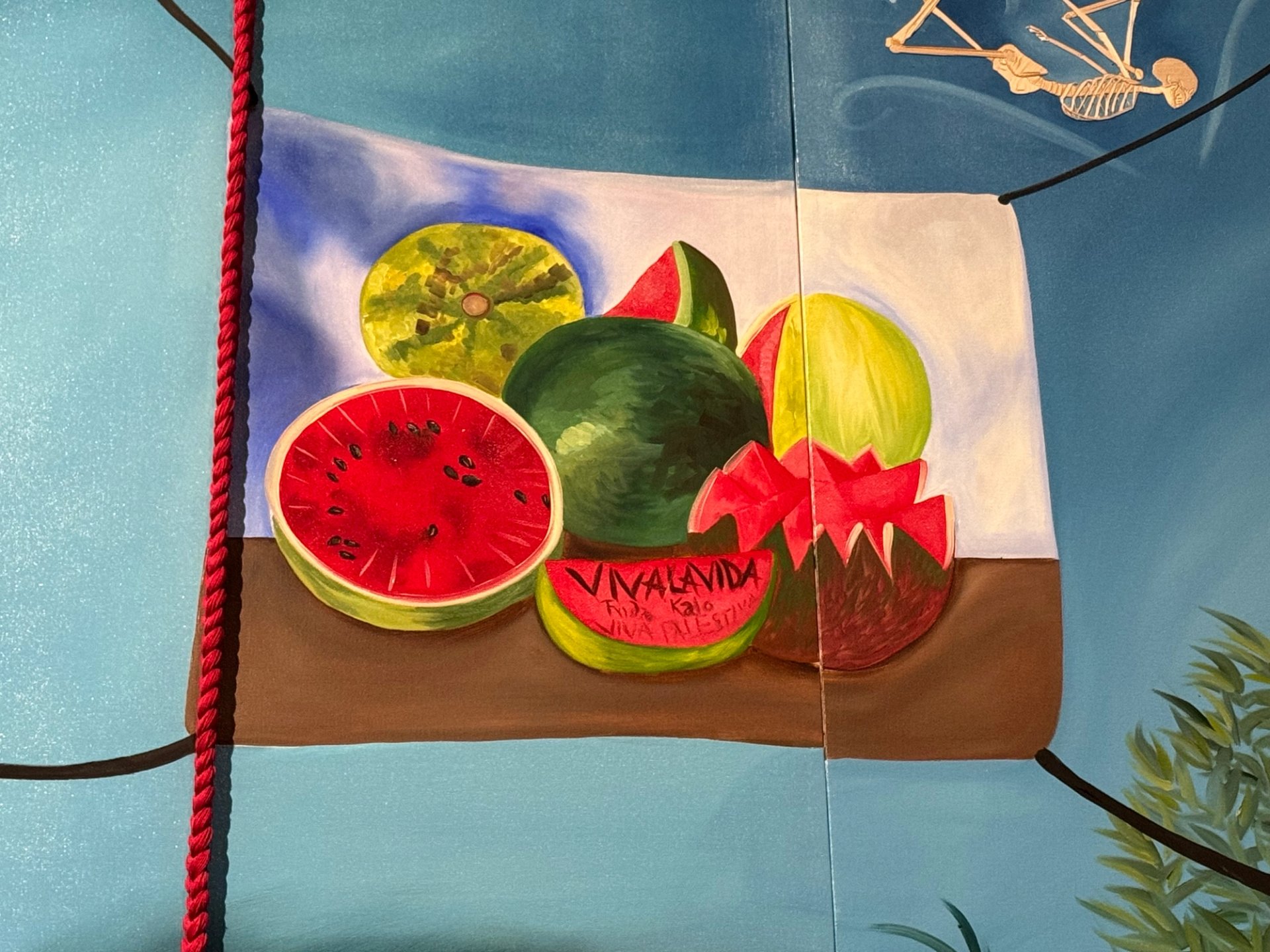 On one watermelon and elsewhere on the canvas, she painted the phrase “viva Palestina, Spanish for “Long live Palestine”. On the back of the canvas, meanwhile, the artist embroidered an anatomical heart and below it scrawled “Hearts that unite against genocide”.