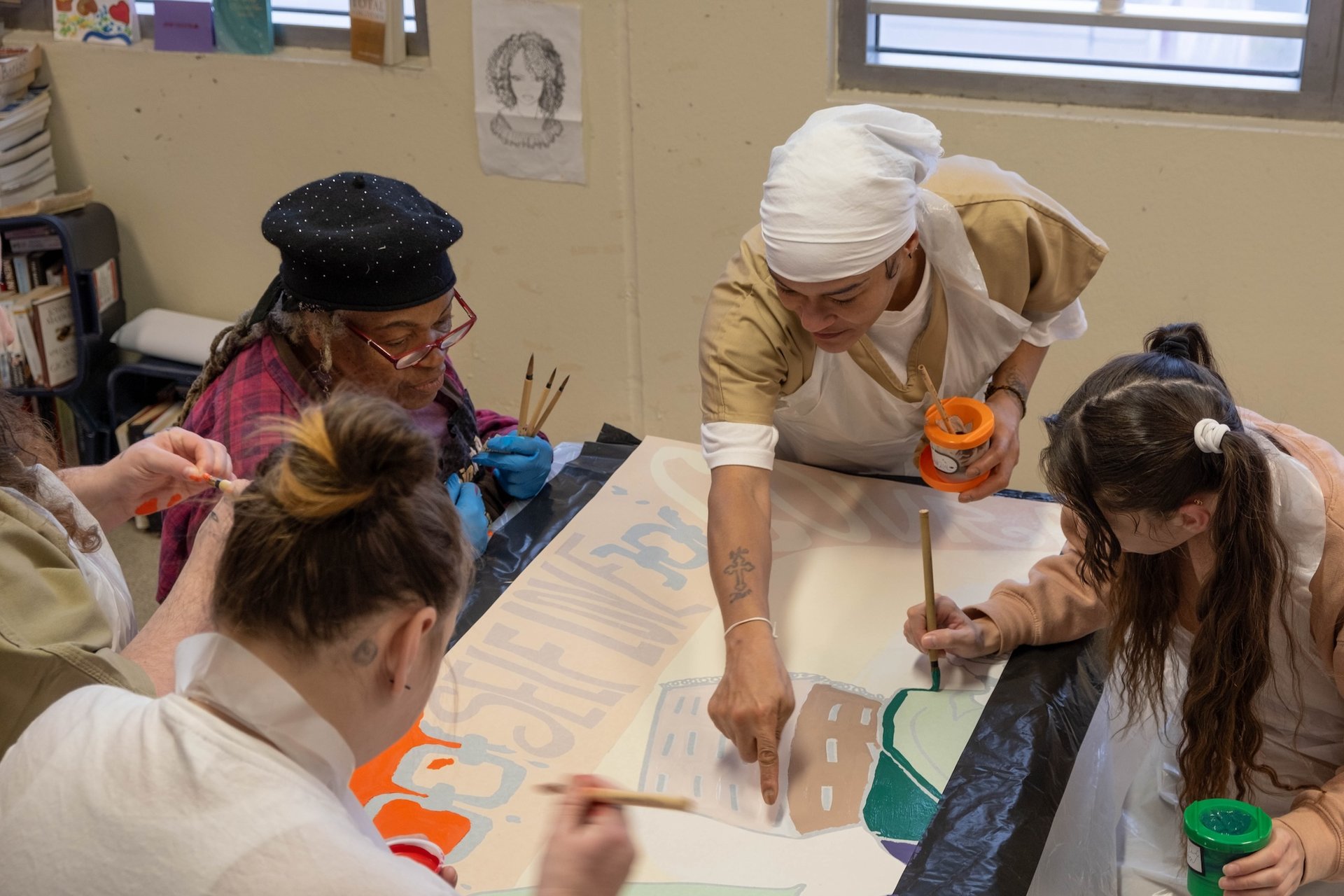 Dindga McCannon provides guidance to NYC Health + Hospitals/Correctional Health Services patients as they paint panels of the mural in January 2024 Photo: Nicole Levy