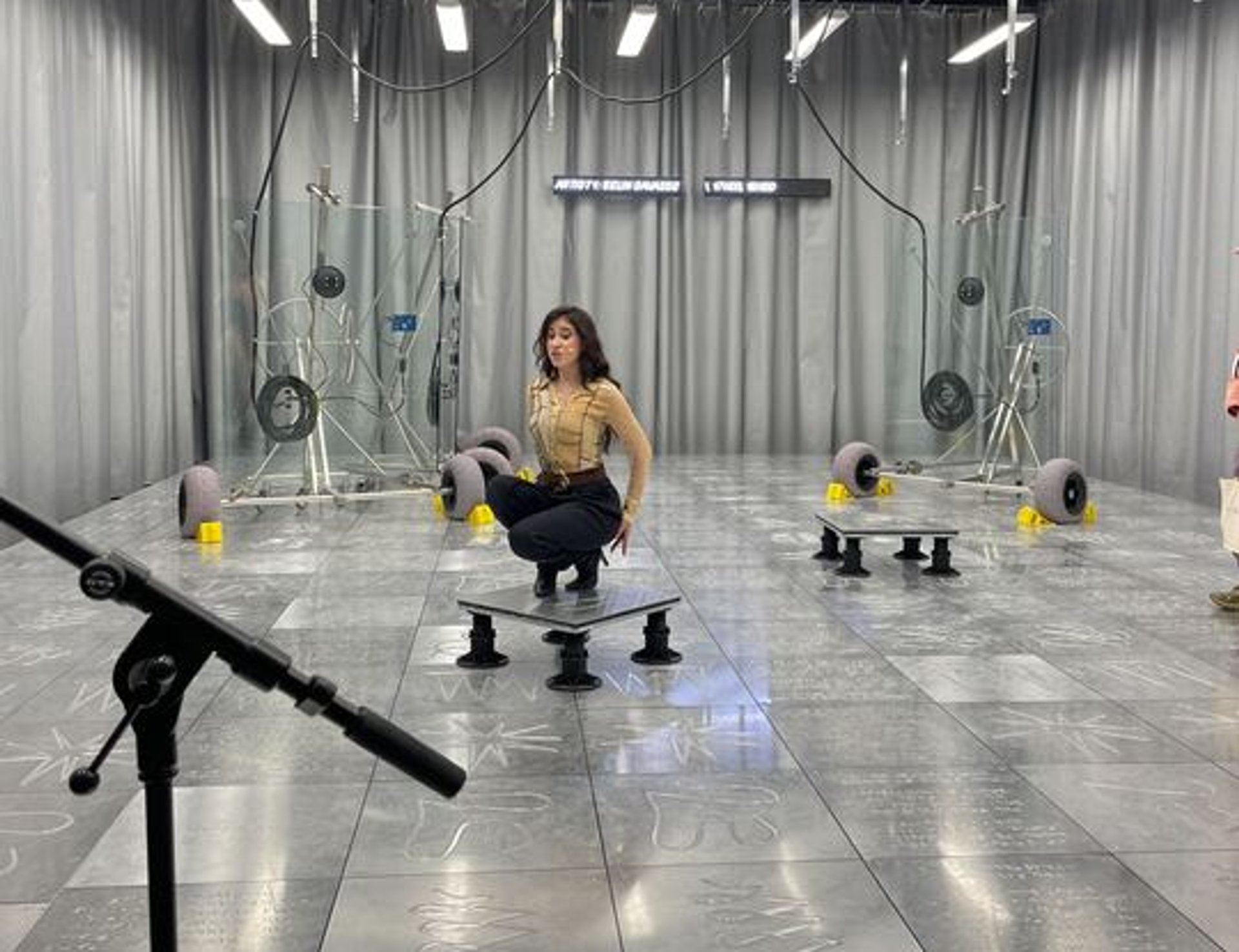 The venue itself is both eye-catching and leg-trembling. Metal floor tiles etched with the exhibition notes are placed atop large speakers that gently vibrate the surface; tremors are also emitted from an installation of microphones and functional glass sound transmitters atop wheeled devices.