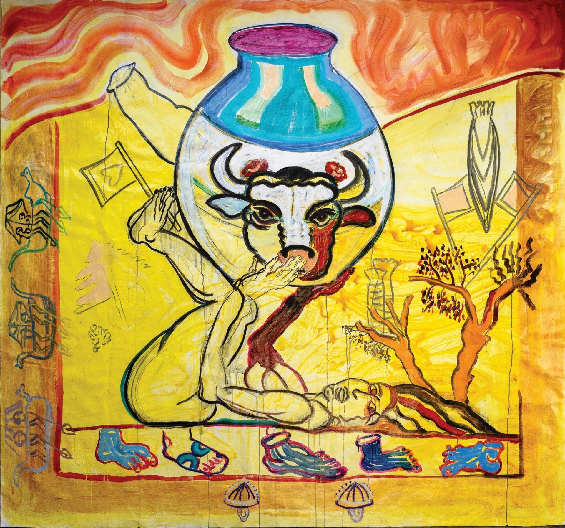Overturning dominant Western narratives is a major theme at this year's Biennale—and Mounira Al Solh does just that in her presentation for the Lebanese pavilion. Al Solh's reinterpretation of the ancient Greek myth of Europa being abducted by Zeus in the form of a bull, seeks less to admonish and preach, but rather to redress the gender imbalance of this story through humour and playfulness. The brightly coloured collages, drawings and films even include a depiction of Europa tossing Zeus's head around like a football. The show is green too: the boat at the centre of the show is made from reclaimed wood rather than Lebanese cedar—traditionally used by Phoenician shipbuilders—which is under threat from climate change.
