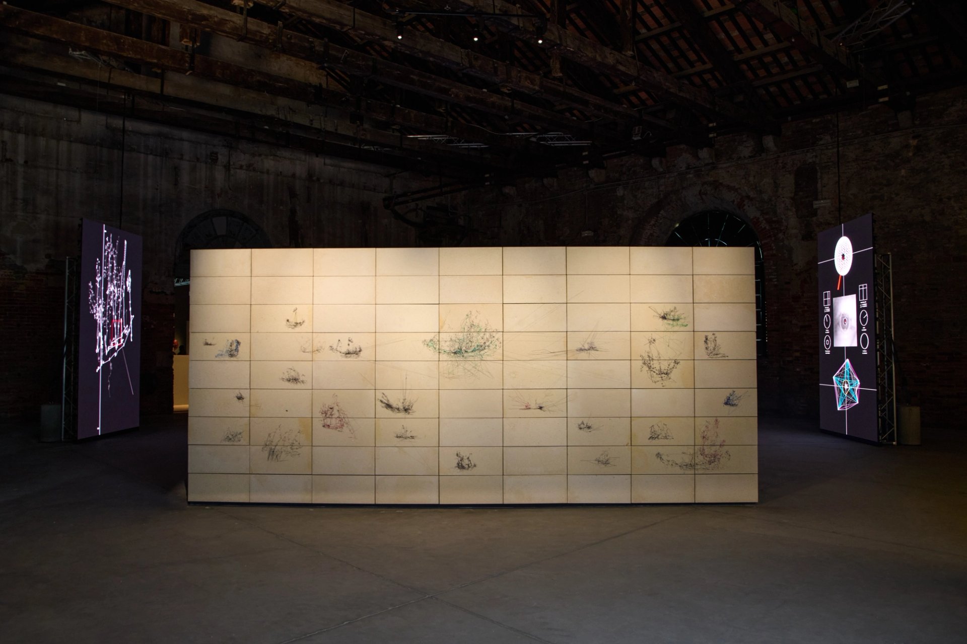 There is a dearth of digital art at this year's Venice Biennale, so Malta's pavilion offers a refreshing segue into the world of technology. Using eye trackers, the artist Matthew Attard retraced ship graffiti that was etched over centuries onto the walls of wayside chapels across Malta. The moving results, projected onto a replica stone surface in the pavilion, draw a line between these historical drawings imbued with religious belief and our blind faith in technology.