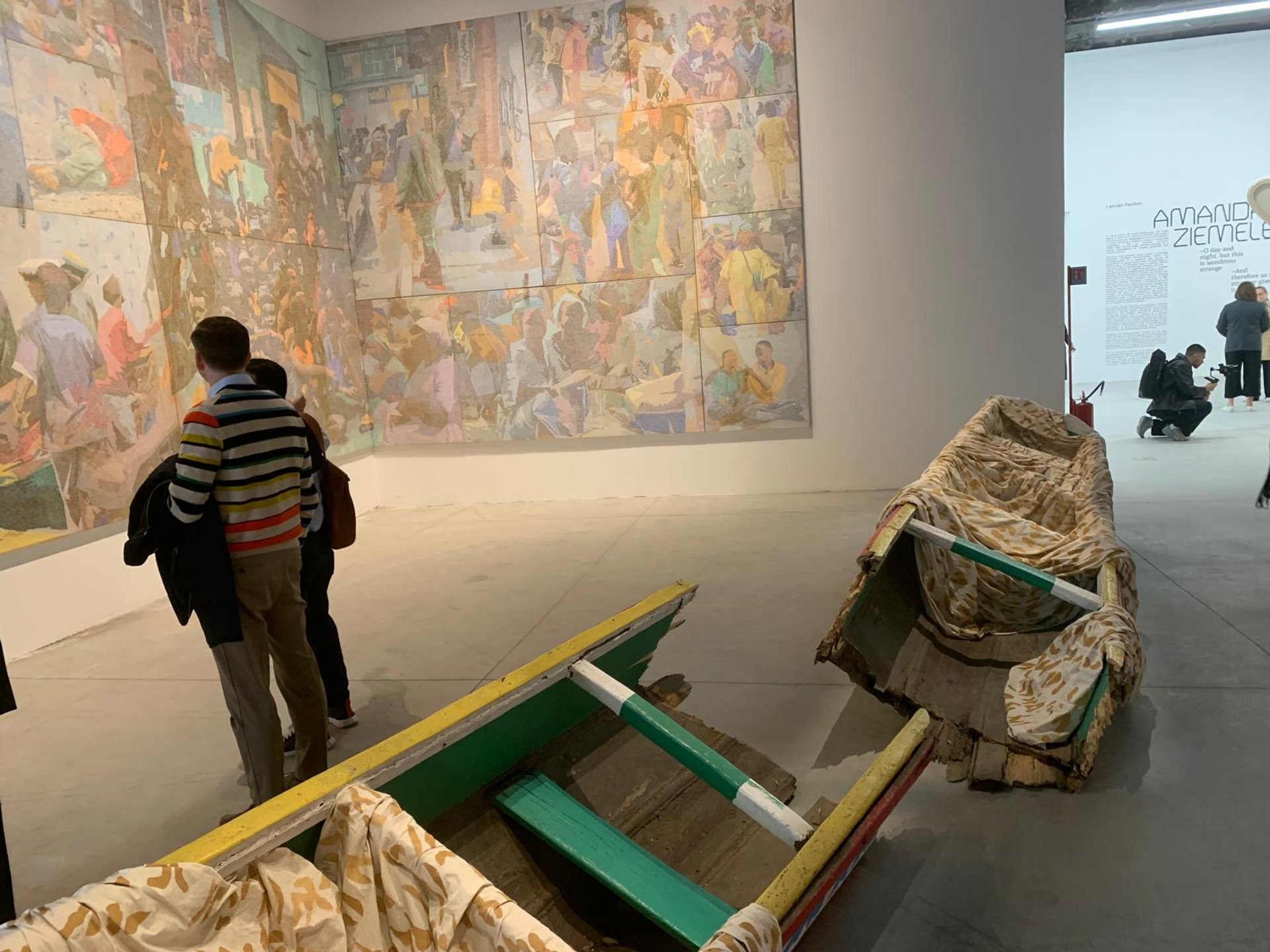 Hazy images of joy and despair make up Senegal’s showstopper of a Biennale debut. A monumental jigsaw of a wall work, formed out of 17 different panels, presents a variety of contrasting scenes: migrants travelling across the Mediterranean, orange lifejackets wrapped around their bodies; a person curled up on a street; teenagers laughing together. Get up close and it becomes clear that these shapes are formed out of minute, gorgeous calligraphic marks, perhaps inspired by the artist’s grandfather, who was a Koranic master. A real-life canoe lies in front of the wall work, broken in half. Rarely has an installation spoken so effectively to the power of connection and the dangers of drifting apart.