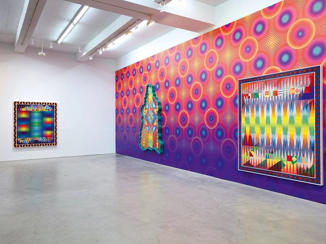 Installation view of the space in which to place me, Jeffrey Gibson’s exhibition for the United States pavilion at the 60th Venice Biennale, 20 April-24 November 24. At centre: WE HOLD THESE TRUTHS TO BE SELF-EVIDENT, 2024 Photograph by Timothy Schenck.
