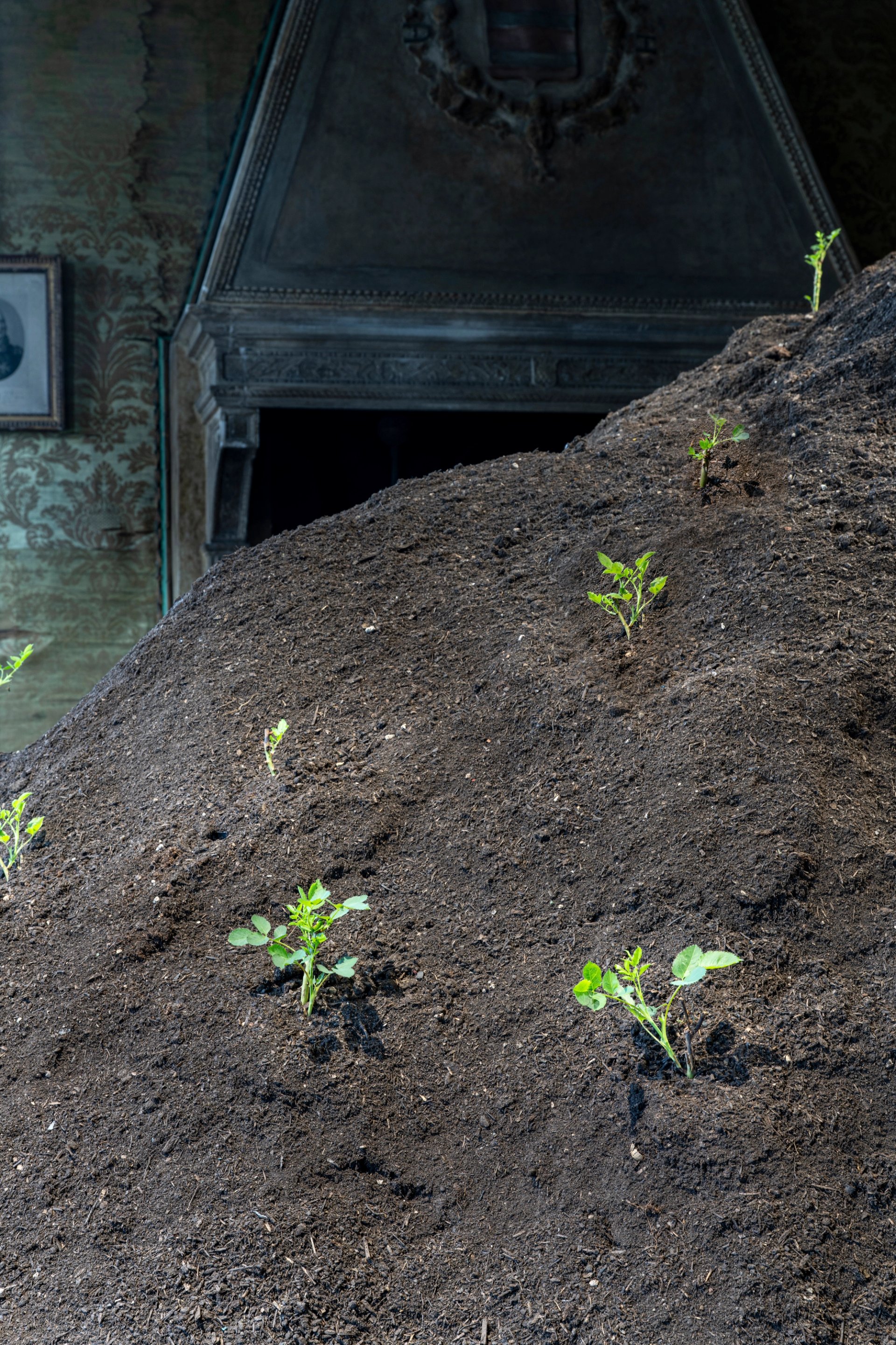 The curators of From Ukraine: Dare to Dream have adopted a theme of hope among the “shadows of global conflicts” for this group show of 22 artists. The beautiful pairing of Kateryna Lysovenko’s wall murals—that look like remnants of a lost pagan-Christian culture on the palazzo walls—and Allora & Calzadilla’s hand-painted rubber flowers strewn across the floor, make a striking contrast with Shilpa Gupta’s dark sound installation Listening Air (2023) nearby. Elsewhere, for her installation Damascus Rose (2016-ongoing), Fatma Bucak sourced the famed roses from locals still growing them in war-torn Syria and brought them to the show—via Lebanon and Saudi Arabia—to be planted in a huge pile of earth. While some shoots have withered after the arduous journey, others are already beginning to bloom.