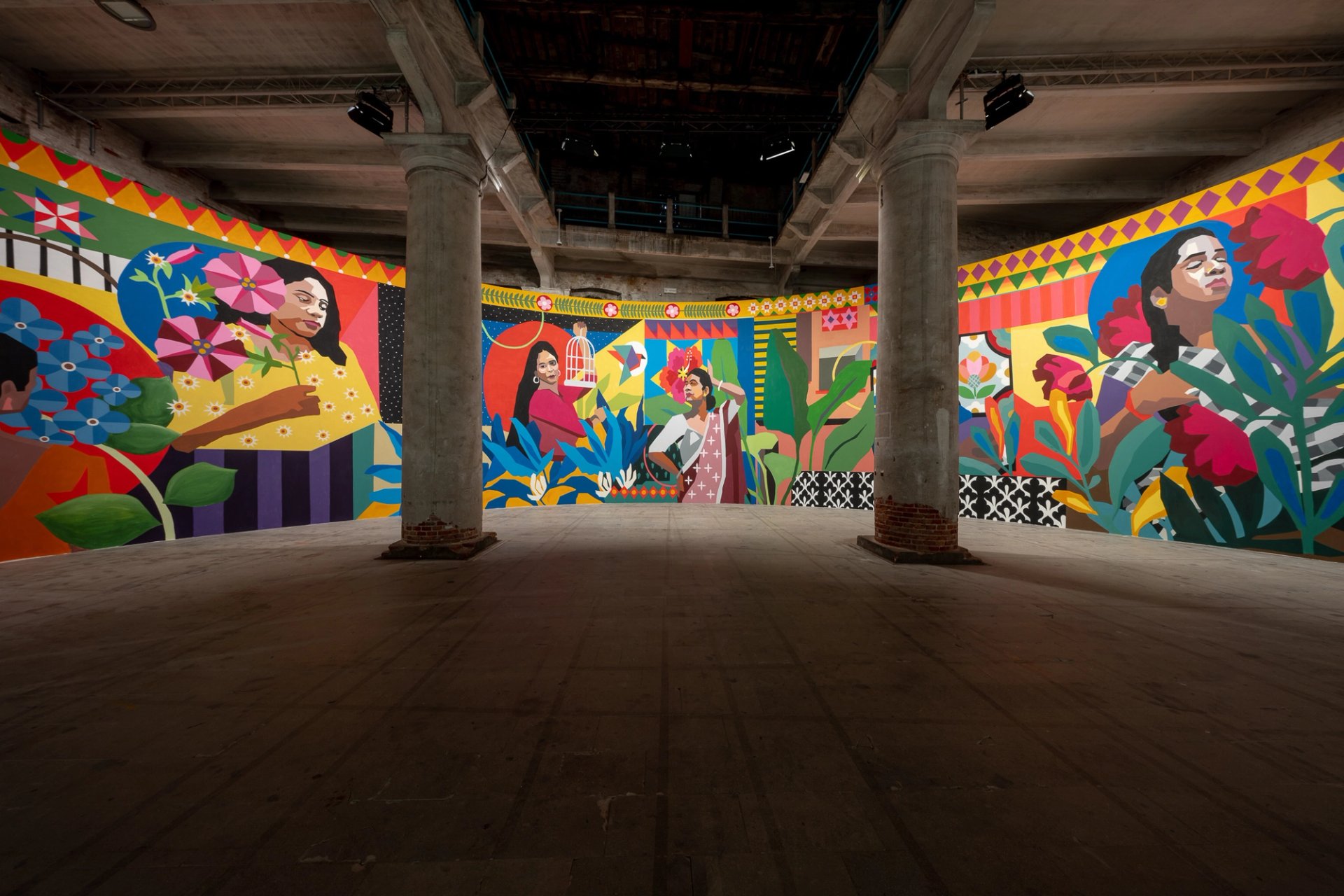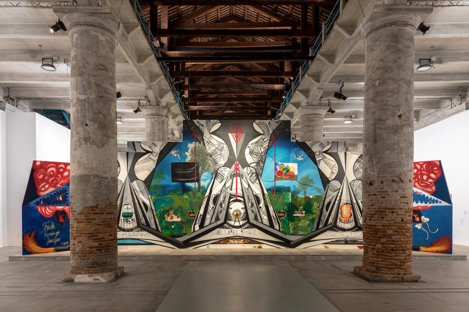 Moments of symmetry and visual correspondence abound in Adriano Pedrosa’s often beautifully displayed Venice Biennale exhibition. Among them are two vast murals at both ends of the Corderie, the 317-metre-long former rope-making factory for the Arsenale.