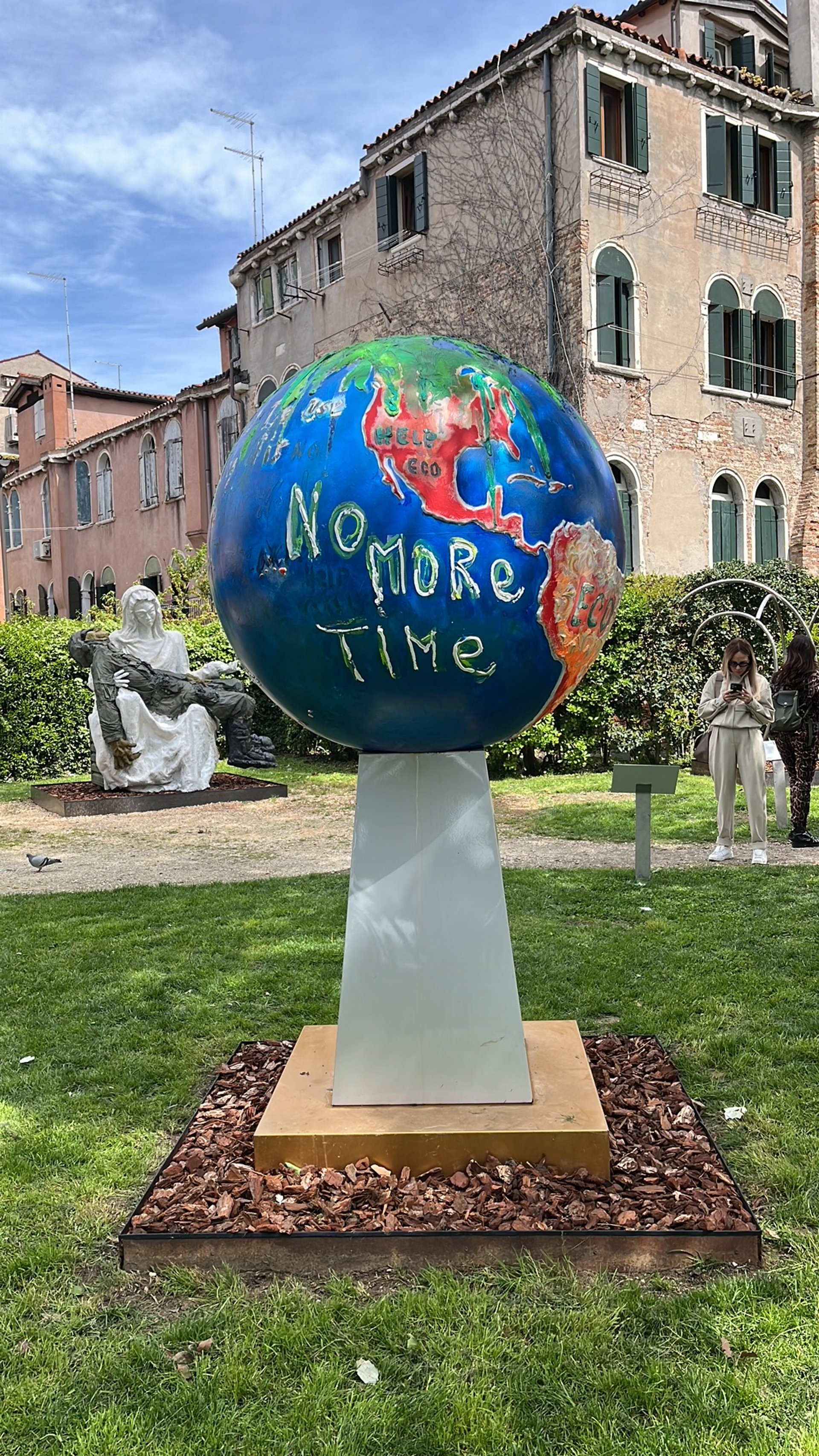 Any artist who deals with ecological issues in their work risks being accused of hypocrisy: producing, shipping and exhibiting art comes with a significant carbon footprint. As Venice's ancient palazzos can attest, global warming needs urgent action—but we are way past the time for obvious statements. In Paola Buratto Caovilla's No More Time Venezia, the words "Life is beautiful" and "Eco SOS", are emblazoned in thick paint on a metallic model of the Earth, with what appears to be streaks of green blood dripping down the sides. But it tells us nothing new to shift our perspective. The best thing the artist could have done for the environment would have been to not make this work in the first place.