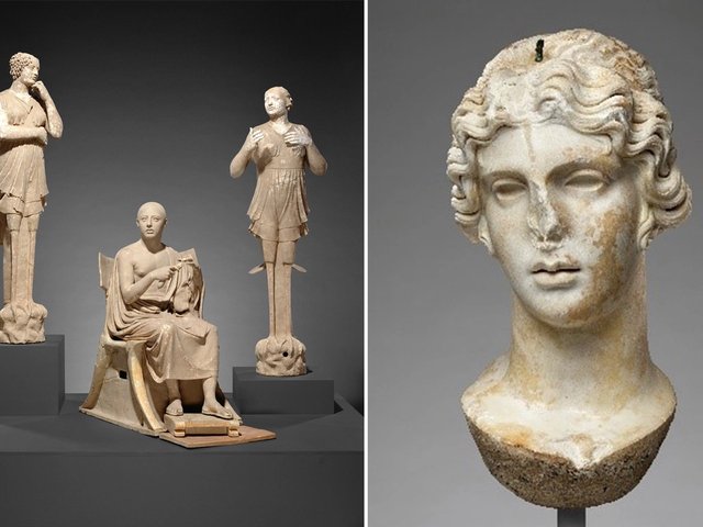 Head from a Statue of a Youth (1st century BC-1st century AD), a bronze head with curly hair and light stubble on the chin, is believed to have been created as a separate cast from the rest of a now-lost life-size body that has never been identified. Researchers know the figure was once whole, because the neck has “evidence of ancient joins on the interior along the break”, according to a press release, and the eyes—now mere holes in the metal—were “once inlaid with an unknown material”.