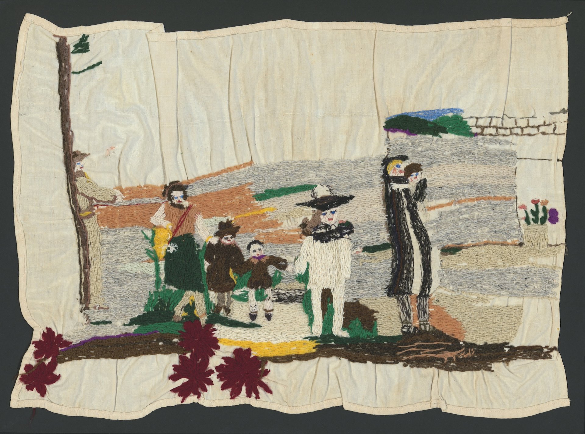 Marguerite Sirvins, Untitled (Family taking a walk in the countryside), undated. Wool embroidery on canvas (unfinished). Collection de l’Art Brut, Lausanne, cab-563. Photo reproduction: Giuseppe Pocetti, Atelier de numérisation – Ville de Lausanne