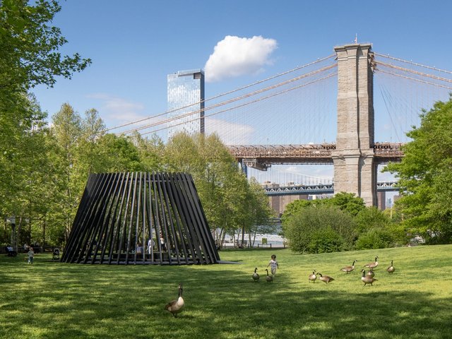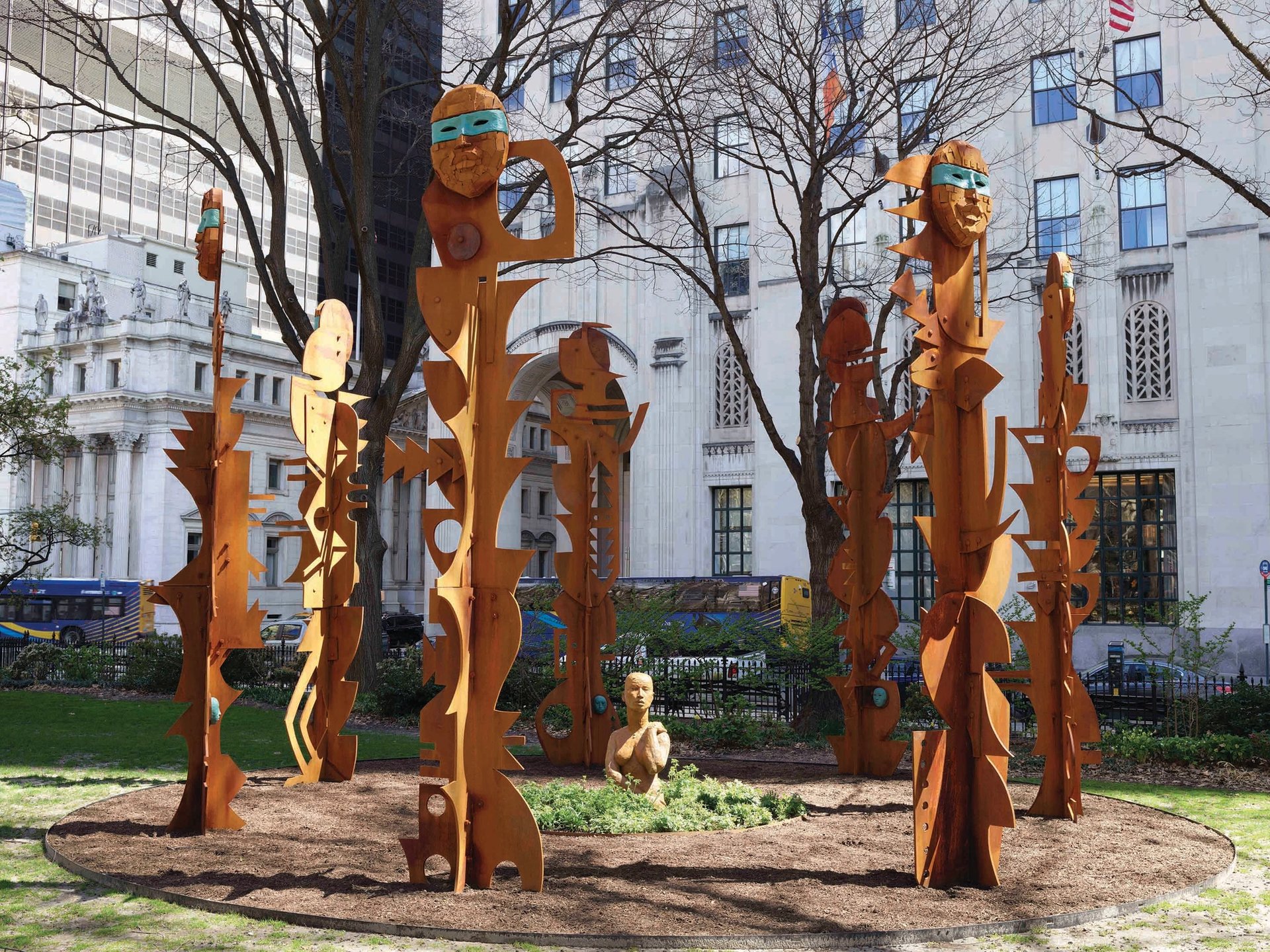 New York’s museums and galleries are pulling out all the stops to lure visitors in town this spring for Frieze, Tefaf and their many satellite fairs and auctions, but the city’s outdoor spaces are also full of art. Visitors strolling The High Line before or after a visit to Frieze can take in Cosima von Bonin’s chorus of fishy rockers or applaud Karon Davis’s giant, bowing ballerina. In the nearby Garment District, pedestrians can gaze up at—and walk under—Chakaia Booker’s 35ft sculpture Shaved Portions (2021). In Madison Square Park, Rose B. Simpson has erected seven towering steel sentinels, her largest works to date, to form a sanctuary with a bronze female figure at its centre. In Central Park’s Doris C. Freedman Plaza, a prismatic sculpture of pink resin by Fred Eversley beckons. And at Marcus Garvey Park in Harlem, Jerome Haferd’s 32ft circular installation Sankofa is both a public sculpture and an outdoor venue, creating a community space.