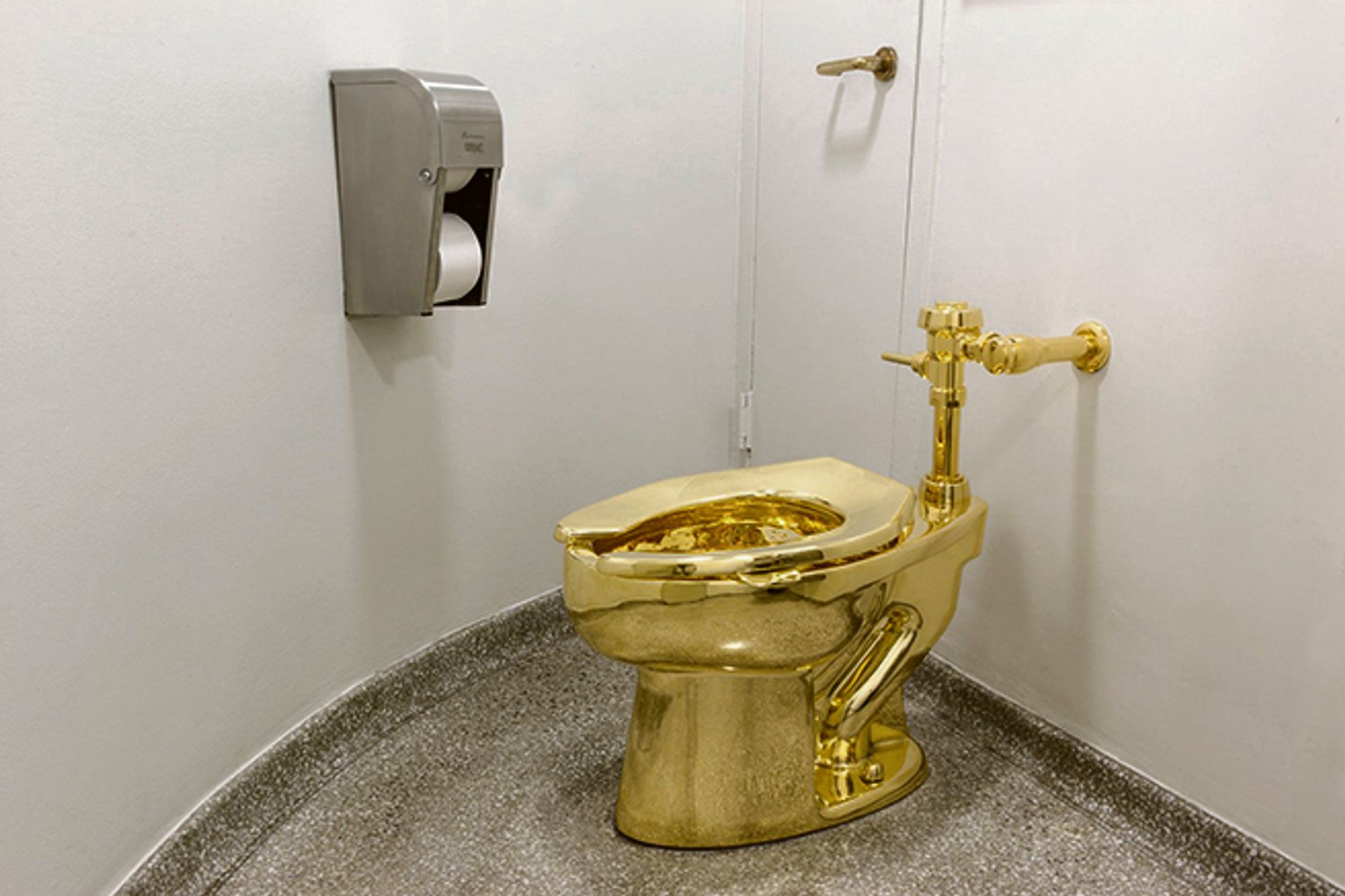 The Italian artist Maurizio Cattelan is making a splash this week in New York with his Sunday installation at Gagosian Gallery in Chelsea replete with gold-plated, bullet-studded panels. Another of Cattelan’s mega gold pieces has also been in the headlines recently—his fully functioning 18-carat toilet (America, 2016), which was removed from Blenheim Palace in Oxfordshire, UK, in 2019. The news that James Sheen, 39, pleaded guilty to the burglary at Oxford Crown Court this past month rather slipped under the radar (in November, three other men were charged in connection with the toilet’s theft but have pleaded not guilty). The high-end lavatory was never recovered (all hopes of finding the golden loo went down the pan).