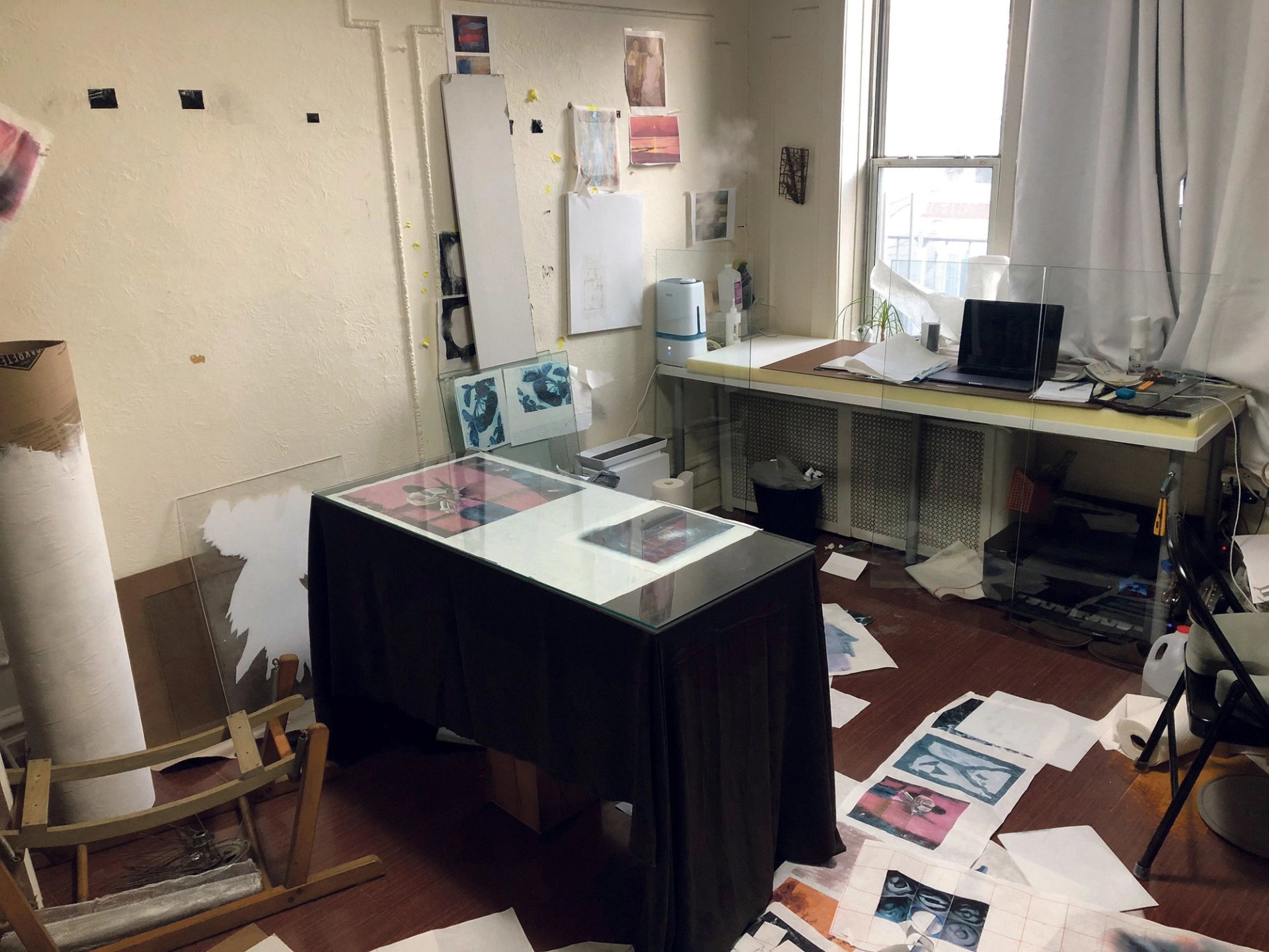 Then the pandemic hit. The market for ice sculptures melted overnight, as did Huang’s other money-making prospects. But while he lost work, he also regained the time and he put it to good use, converting his small Brooklyn bedroom into an ad hoc studio where, for the first time since college, he began making art again. The momentum outlasted the lockdown, and now Huang splits his days doing installation photography for galleries and making work in his shared Sunset Park studio. (He pays around $3 per square foot.) A series of the artist’s inky, graphic prints on rice paper and canvas are included in Canon, a show of work by three Cooper alumni on view until 11 May at Kapp Kapp in Tribeca.