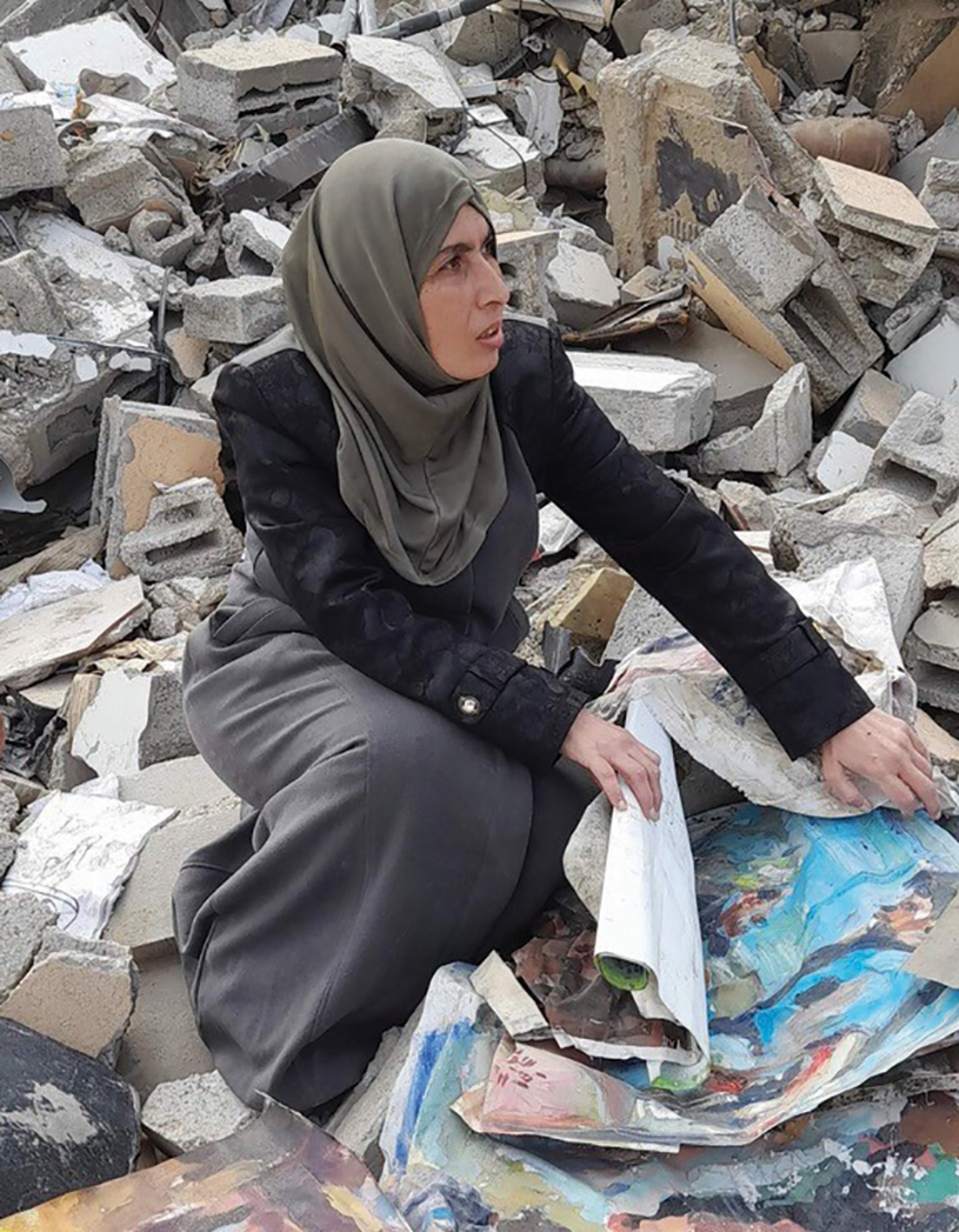 Ruqaia Alulu recovered just 33 of her 800 paintings from the rubble of her apartment in Bureij Ruqaia Alulu