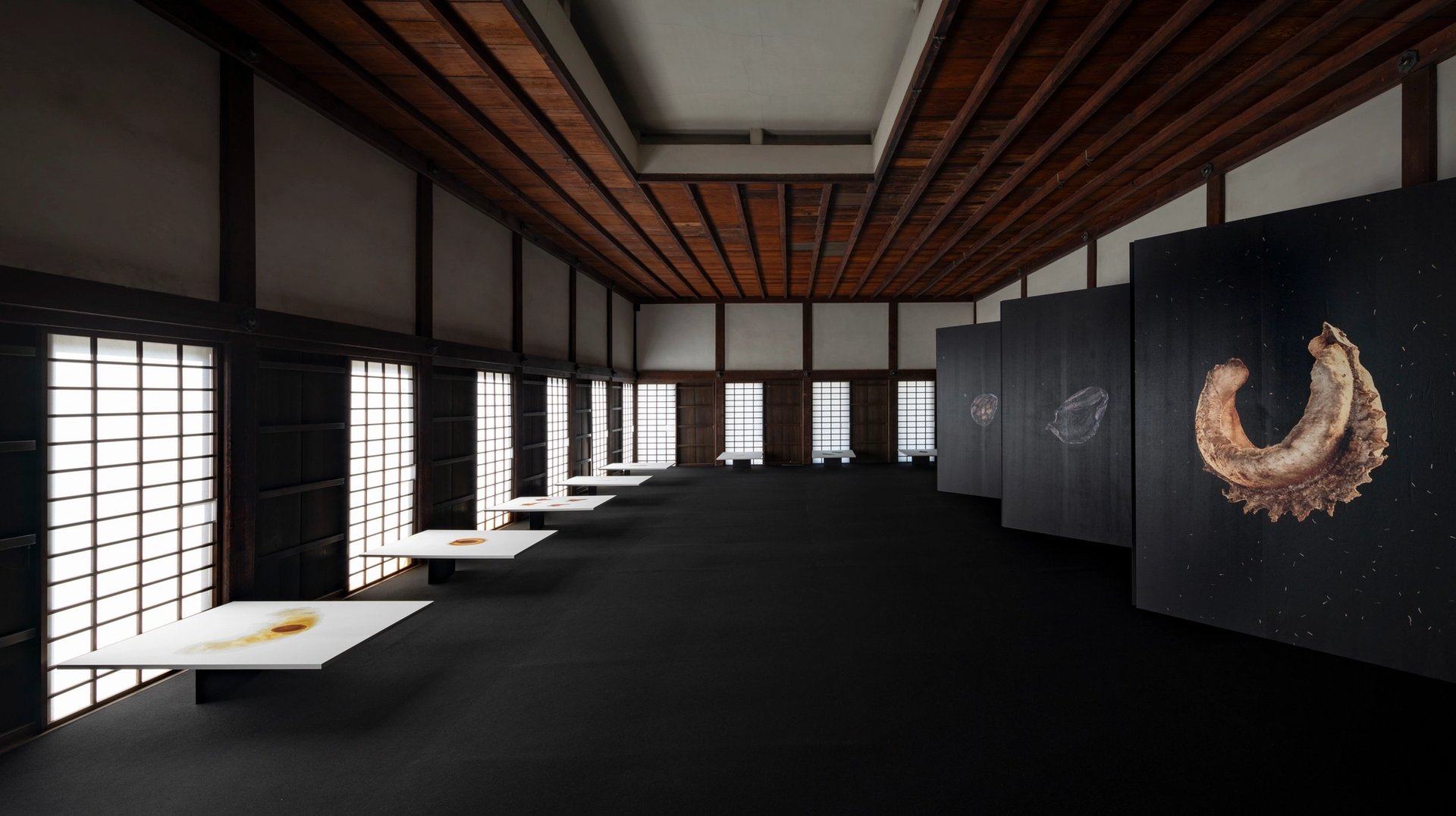 The photographer Thierry Ardouin, for example, has collaborated with the designer Shinichiro Ogata to adapt his Seed Stories for display in the former kitchens of Nijō Castle. This long-term project, originally conceived as a book (published by Atelier EXB in 2022), is a celebration of the aesthetics of seeds that also addresses some of the history and the cultural, scientific and ecological questions they raise. Ogata has created scenography around the concepts of yin and yang, showing Ardouin’s works on screen angled in such a way as to put them in conversation with the shadow and natural light in the building.