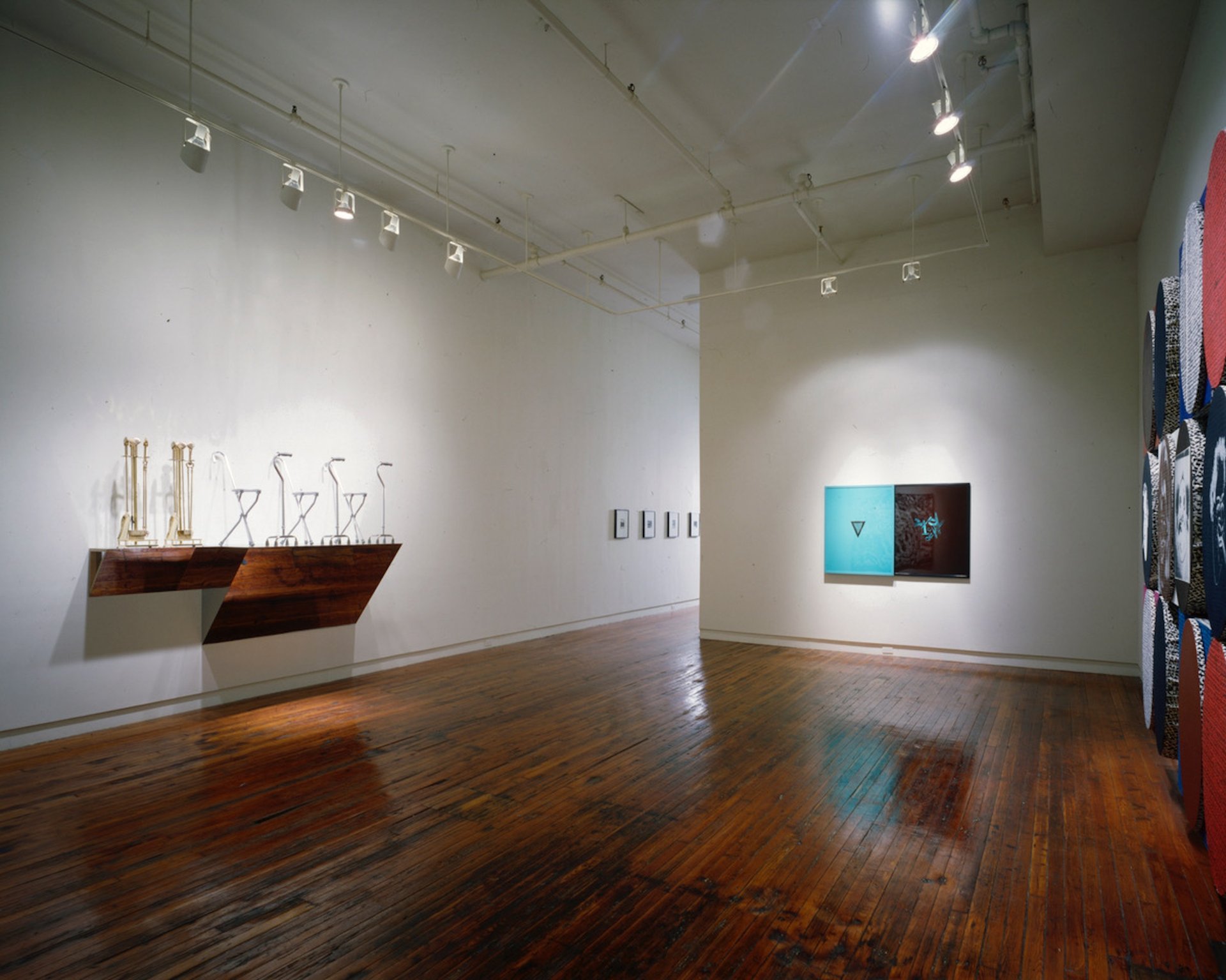 Installation view of an exhibition featuring works by Haim Steinbach, James Welling, Sarah Charlesworth and Meyer Vaisman at Jay