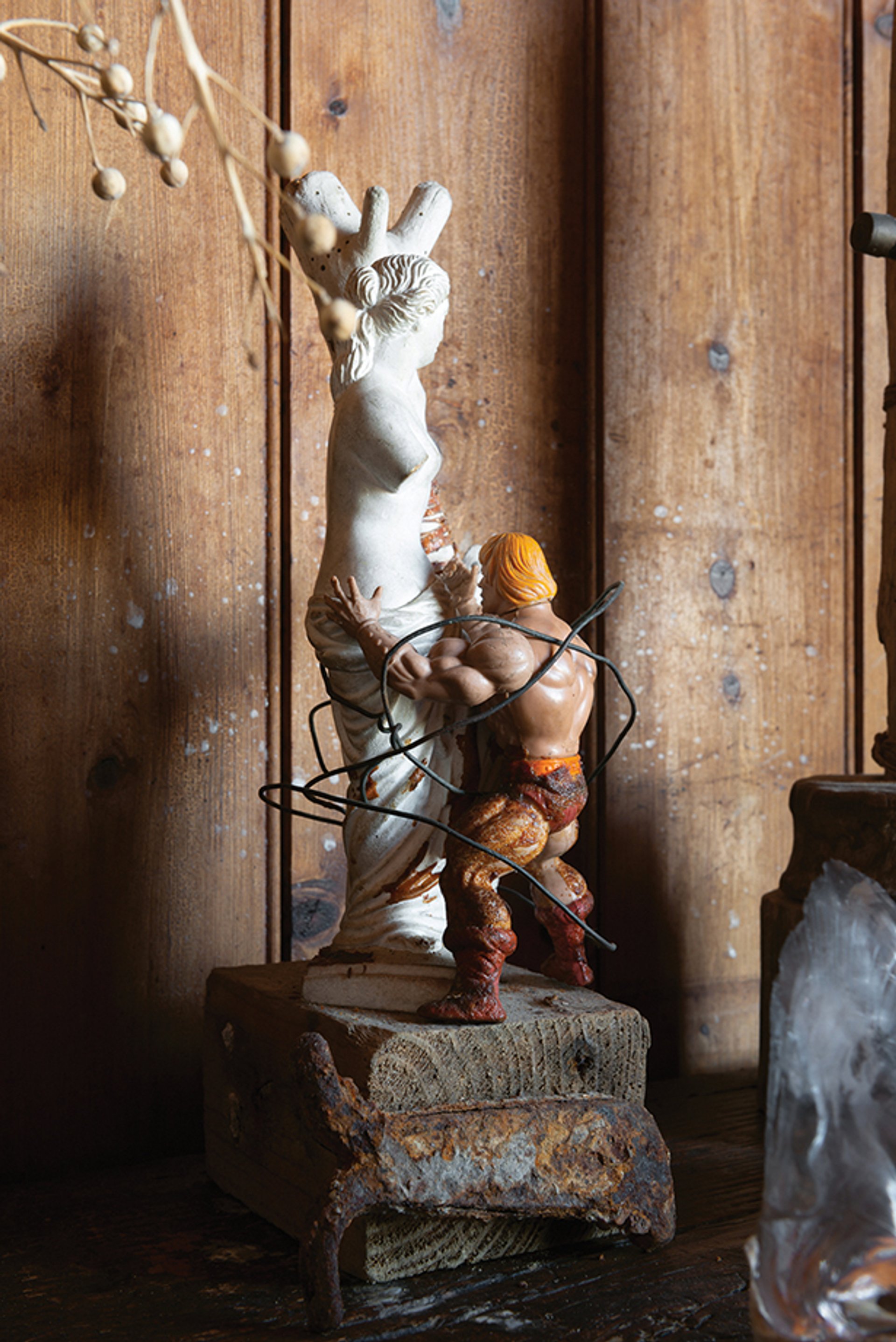 There are many talismans made from the locally abundant “holey stones” strung together—McCarragher records his disappointment at never having been being given one of these by Collins—and a prodigious bronze dildo cast by the musician and occultist Genesis P-Orridge, copies of which were sent out to disfavoured record company execs (how it entered the Jarman collection is a mystery). There is some good brown furniture in the Kettle’s Yard vein. Jarman, or Collins, or both of them, used wire to bind things together in ad hoc union: a plastic He-Man figure and a statuette of an armless Grecian maiden; two chimney pots (“I found the act of the stronger pot lending its strength to the other comforting,” McCarragher says). Jarman carved little billets-doux to Collins into the surface of glass blocks, and attached John Donne’s poem “The Sun Rising” to the outside of the house, letter by letter.