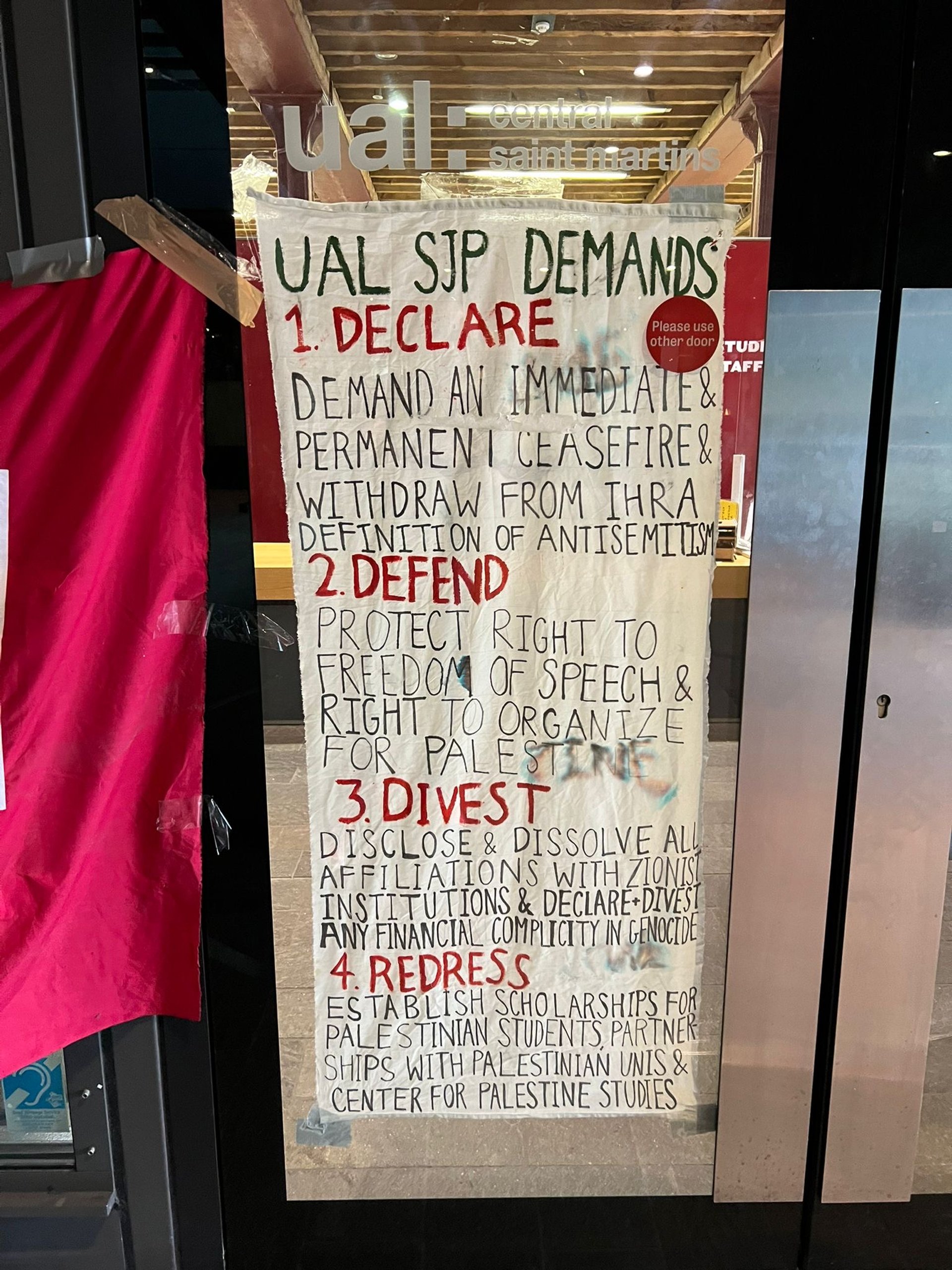 The protestors say they have had overwhelming support from students and staff at UAL, including Jewish students and teachers. In January, more than 800 staff, students and alumni of UAL signed an open letter expressing their solidarity with Palestinians and pledging to "support and rebuild education and cultural institutions in Gaza and across Palestine".