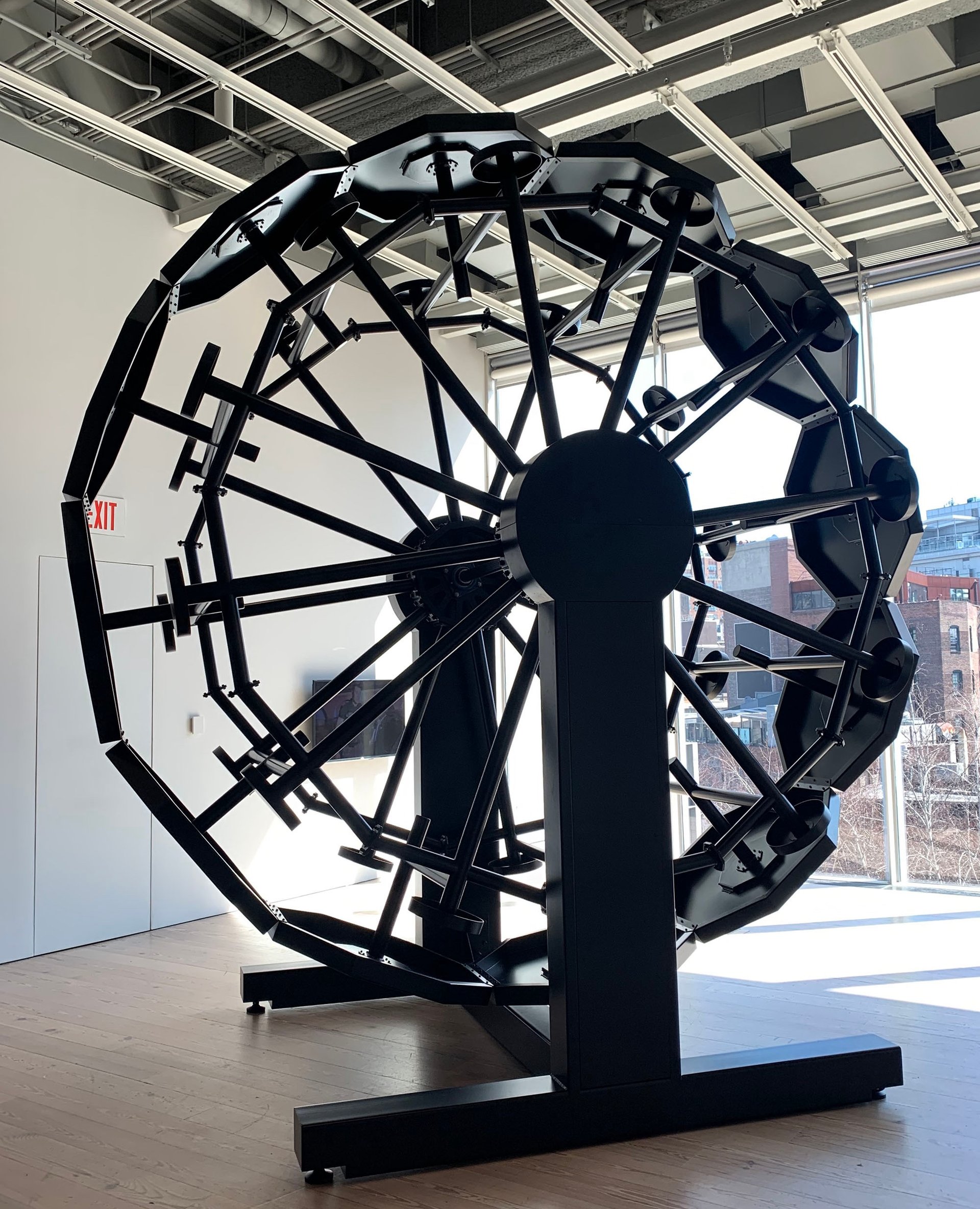 Smith, who was born in Los Angeles and is based in New York, works across a range of media to highlight the insidious, sometimes seemingly innocuous ways that US systems of power and control are embedded in visual and material culture. Her Coloring Books series of paintings, for instance, magnifies the imagery in colouring books that are distributed to children whose family members have been affected by the prison system. She has also created a series of seemingly abstract, large-scale sculptures made from the generic furniture used in US prisons. For example, one of her contributions to the 2022 Whitney Biennial, A Clockwork (2021), resembles a ferris wheel composed of visiting-room tables and chairs.