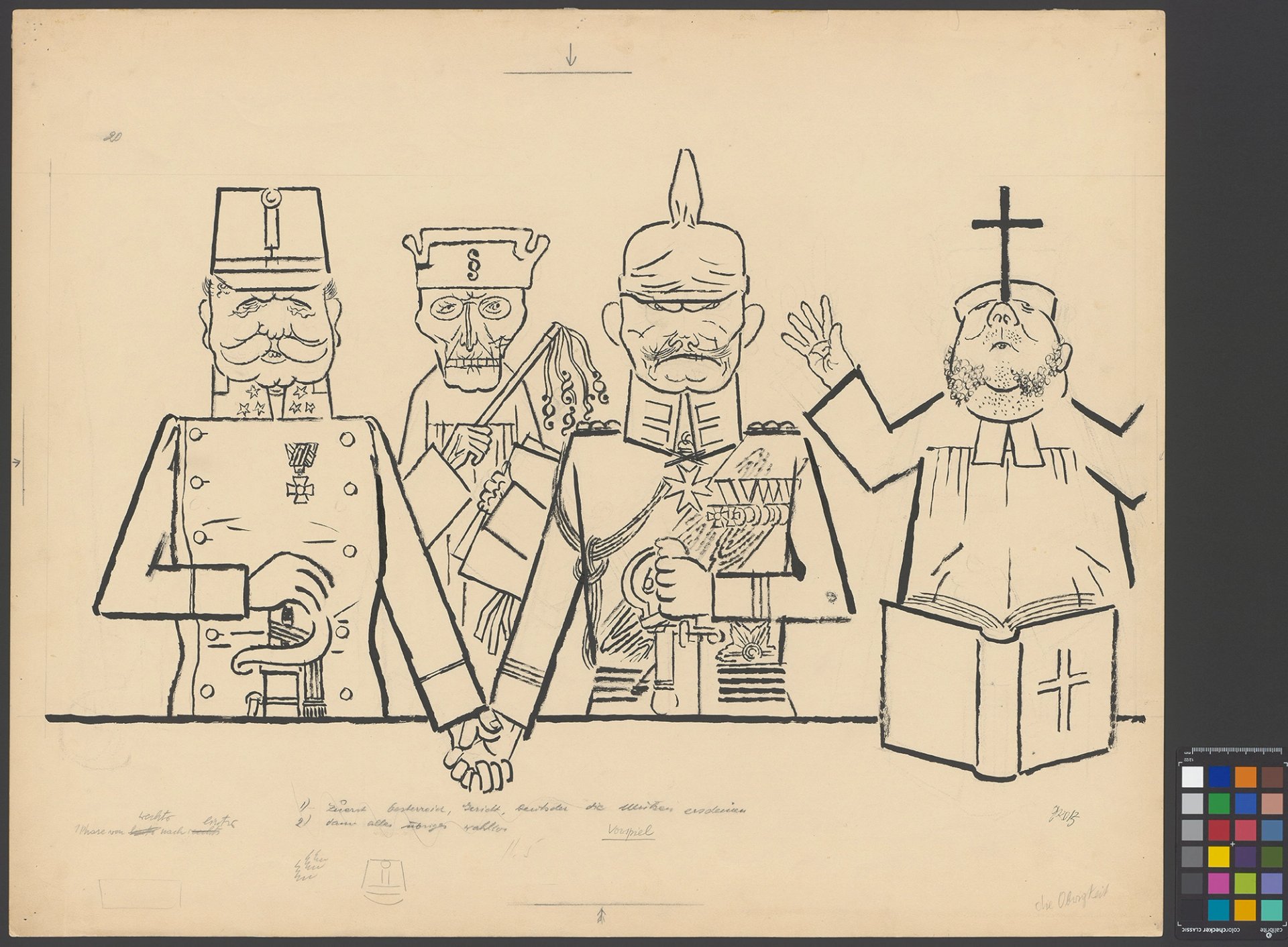 The work was created, along with some 300 others, for Erwin Piscator’s staging of The Good Soldier Švejk, in 1928. Piscator’s adaptation of the dark satirical novel by the Czech writer Jaroslav Hašek was considered a milestone in theatre history, not least because of Grosz’s set design and the use of film projections on stage, which included animated sequences with several soon-to-be-banned drawings.