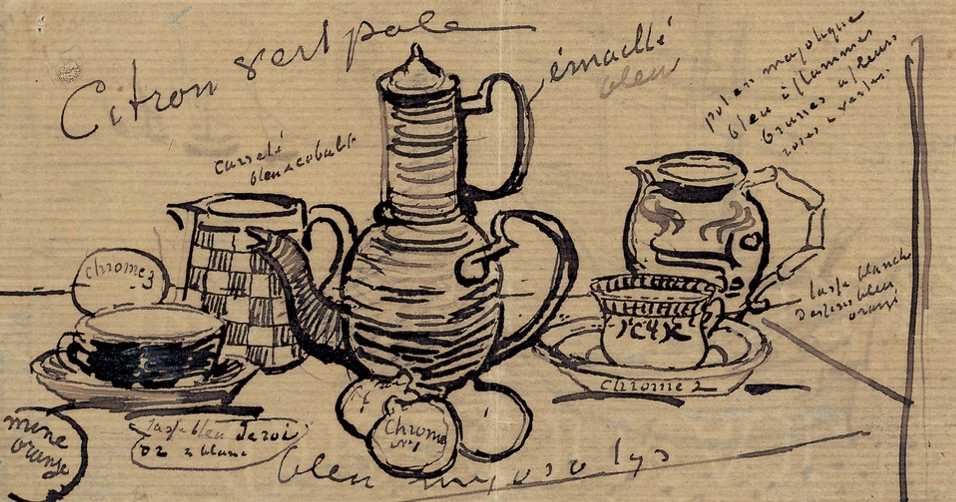 Van Gogh’s sketch of Still life with Coffee Pot with colour notations, in his letter to Emile Bernard from around 7 June 1888