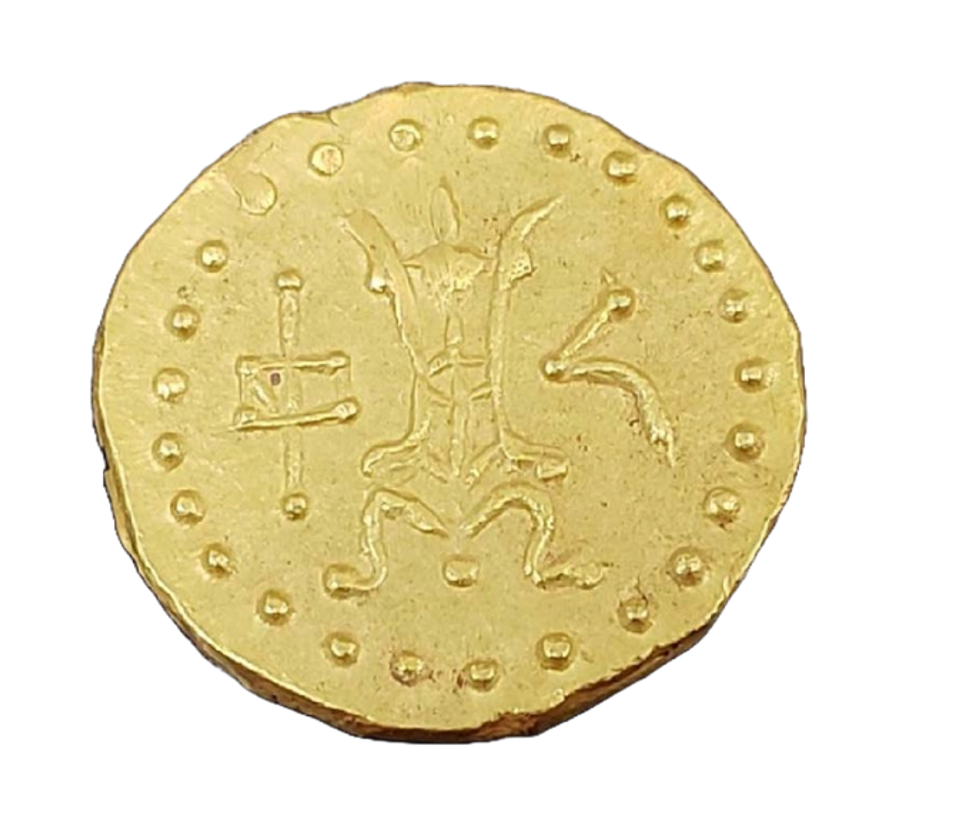 Verso of the Gold Strato I Coin (around 105BC-85BC), one of the stolen antiquities returned to Pakistan this week Photo: @ManhattanDA via X