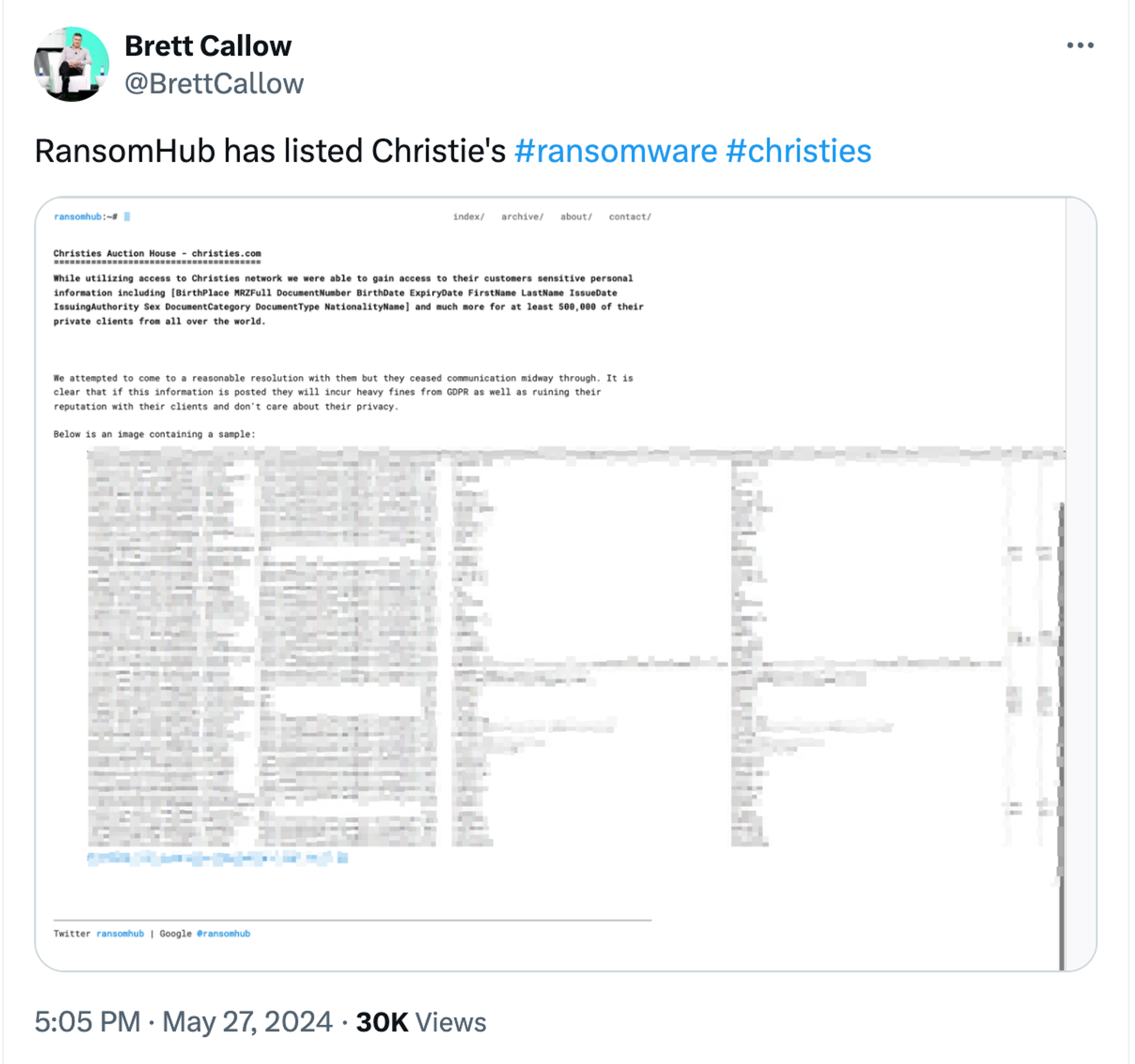 In a post on the dark web on Monday—a screenshot of which was shared on X by Brett Callow, a threat analyst with the cybersecurity firm Emsisoft—RansomHub said it had gained access to data on “at least 500,000” Christie’s customers from “all over the world”, including full names, document numbers, nationalities and birth dates.