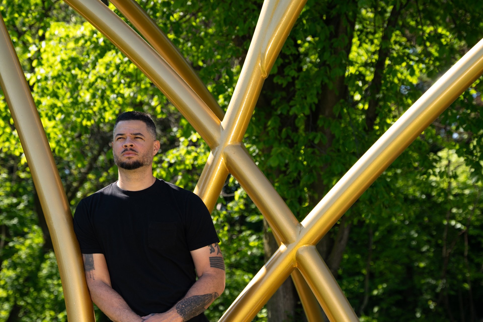 Portrait of Jordan Weber in front of his permanent installation New Forest, Ancient Thrones (2024), which crowns the entryway to the Detroit Remediation Forest in East Canfield Art Park, East Canfield Village. Commissioned by Sidewalk Detroit and created in collaboration with Canfield Consortium. Photo by Jasmine Sumlin.