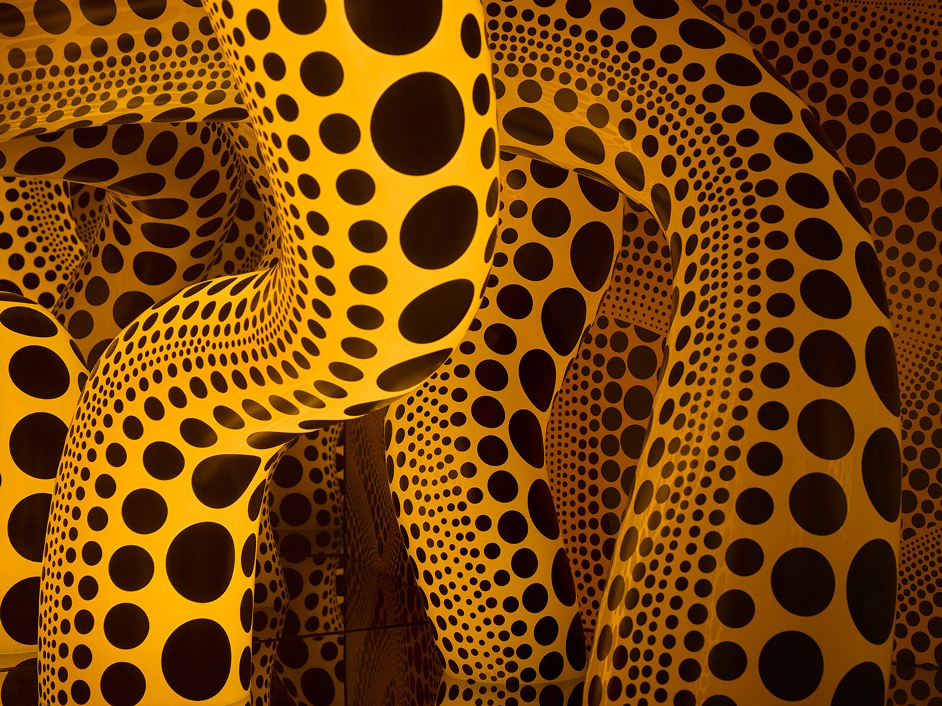 Phantom Polka Dots of Fate, Ordained by Heaven, Were the Greatest Gift Ever for Me comprises a five-sided chamber held above the ground by elegant metal legs, with the sides of the pentagonal sculpture alternately mirrored and transparent, both reflecting the work’s surroundings and revealing the infinite space within. Within this chamber are three tentacle-like forms adorned with the artist’s ubiquitous yellow and black polka-dot motif, each animated by an inner light. Radiating in the paradigmatic dot-patterning which flows down the centre of the rotund tentacle’s skin, the work reflects Kusama’s lifelong preoccupation with the infinite and sublime, as well as the twin themes of cosmic infinity and personal obsession as found in pattern and repetition.