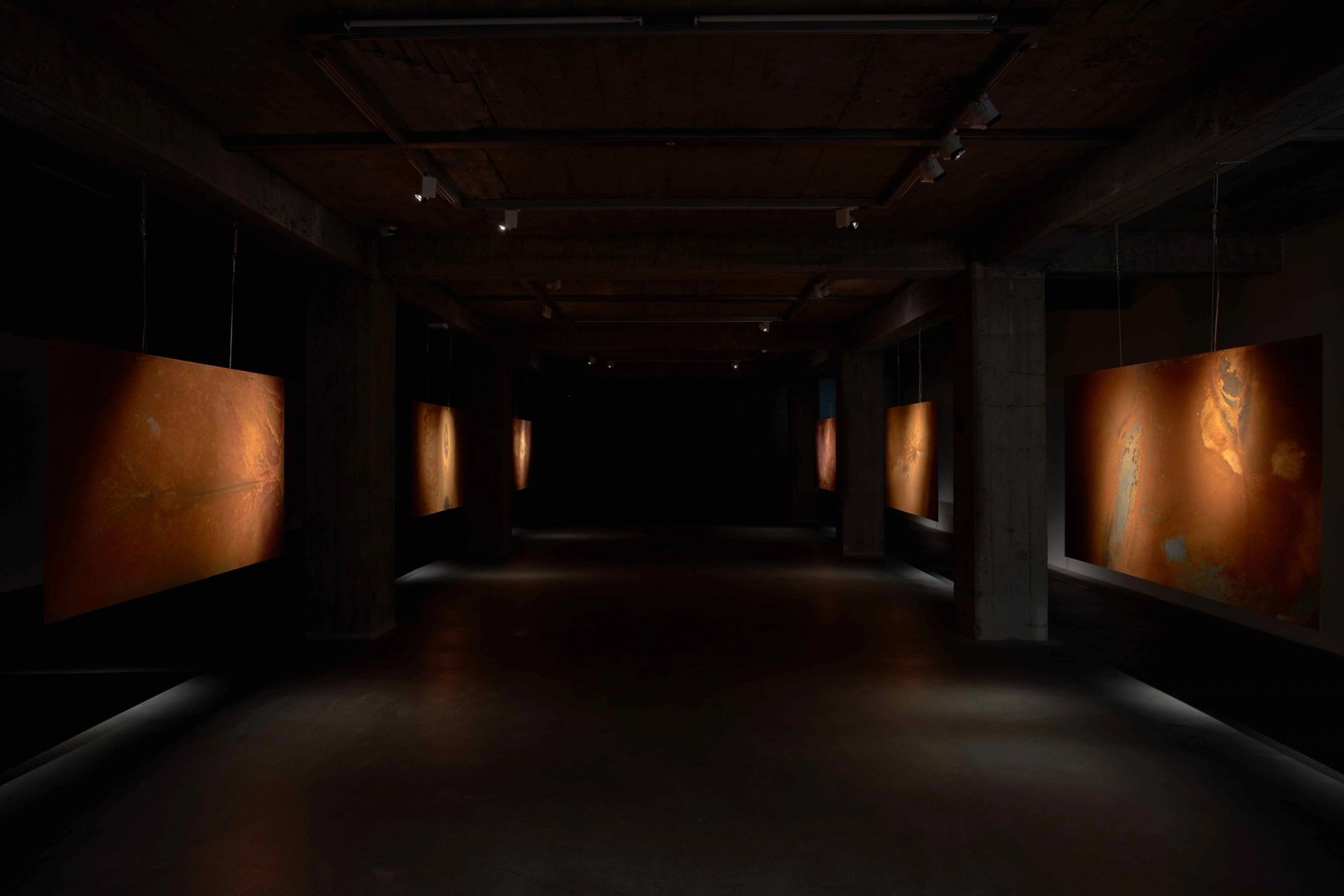 REK (Plate Tectonics) comprises six hand-rusted steel sheets hung from the ceiling, each with a speaker behind it playing out a soundtrack at varying frequencies
