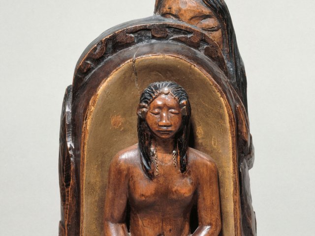 Tahitian and Marquesan objects, on loan to the exhibition, include a carved bone-and-shell earpiece whose distinctive geometrical pattern can be recognised in the composition of some of Gauguin’s paintings including The Sacred Mountain (Parahi Te Marae) (1892), on loan from the Philadelphia Museum of Art. The earpiece is on loan from the Musée du Quai Branly in Paris.