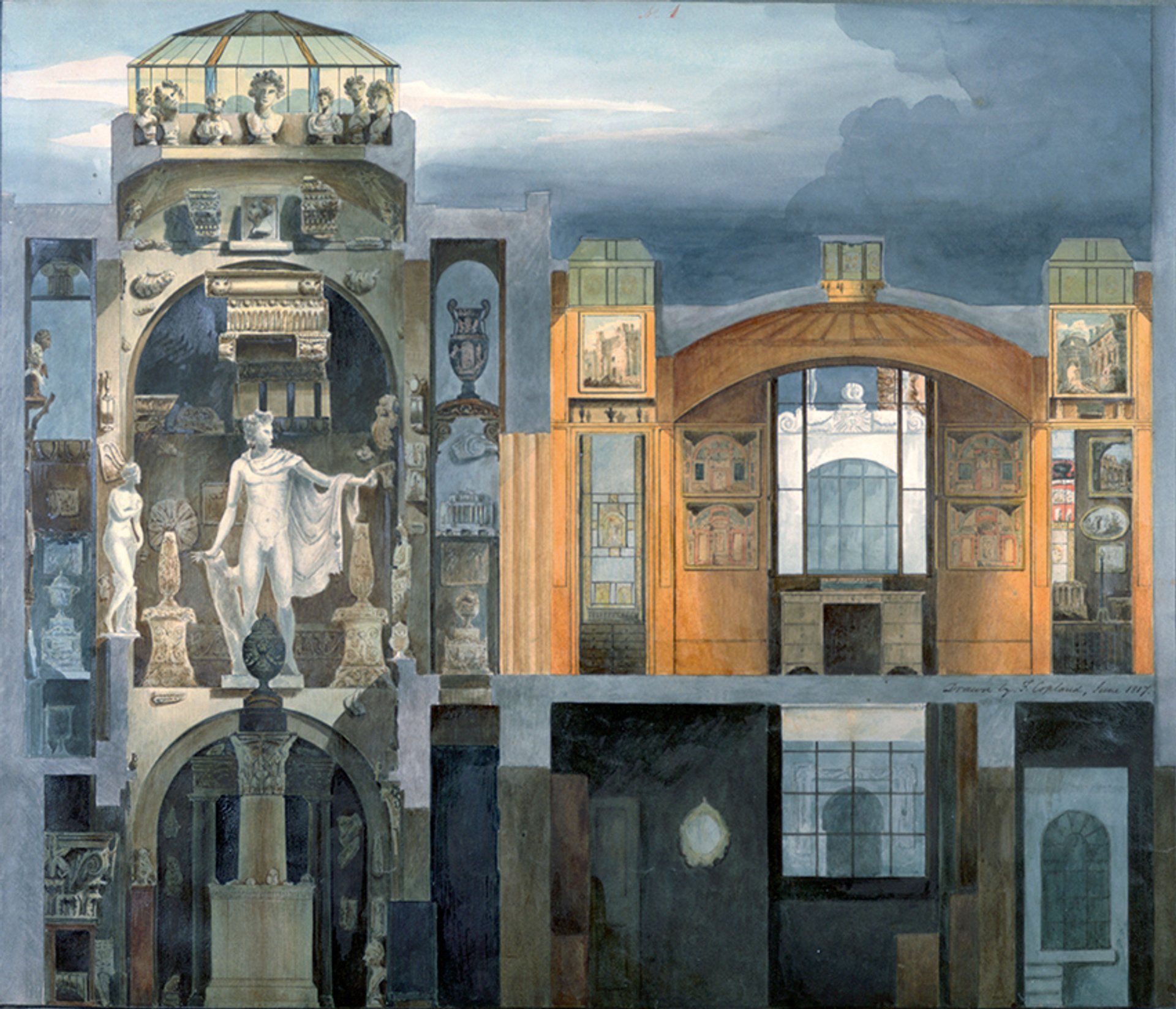 The collection first took shape at Soane’s former family home, Pitzhanger Manor in Ealing, and, following its recent restoration, it is now easier to imagine the collection there, in the seat of the Soane dynasty of architects: a succession that never succeeded. The son and brother of bricklayers, Soane had risen through working in the offices of George Dance the Younger and Henry Holland, through studying and shining at the Royal Academy schools and (unlike his friend J.M.W. Turner, the son of a barber) through marrying Elizabeth “Eliza” Smith, an heiress. Collecting, especially of objects from well-known collectors, helped Soane to cover his roots as a rising academician and gentleman. Once it became clear that the disappointing sons (John and George) had no appetite for a family business, the Ealing villa was sold and the study collection of architectural casts, fragments and art had to be crammed into the terraced Lincoln’s Inn Fields townhouse. After his wife’s death in 1815, Soane arranged the collection for his assistants and the students from his Royal Academy lectures, to help foster the British school of architecture and art. The idea of creating a more public museum coincided with the opening of the National Gallery in John Julius Angerstein’s house in Pall Mall in 1824. Soane’s architectural models and designs, contemporary British paintings and sculpture could be seen as a combined Tate Britain, National Portrait Gallery and Victoria and Albert Museum of its day, as well as a museum about himself.