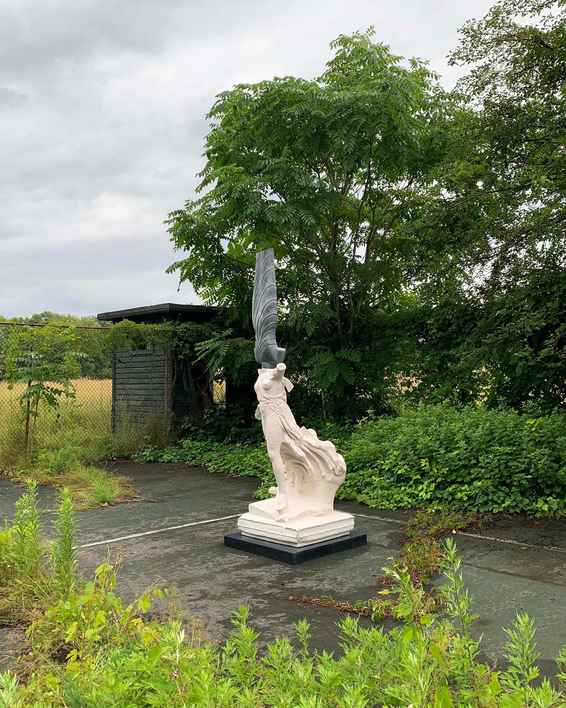 Xu Zhen's Eternity - Standing Bodhisattva, Statue of Nike of Paionios (2017-22) on an overgrown tennis court at The Campus Benjamin Sutton