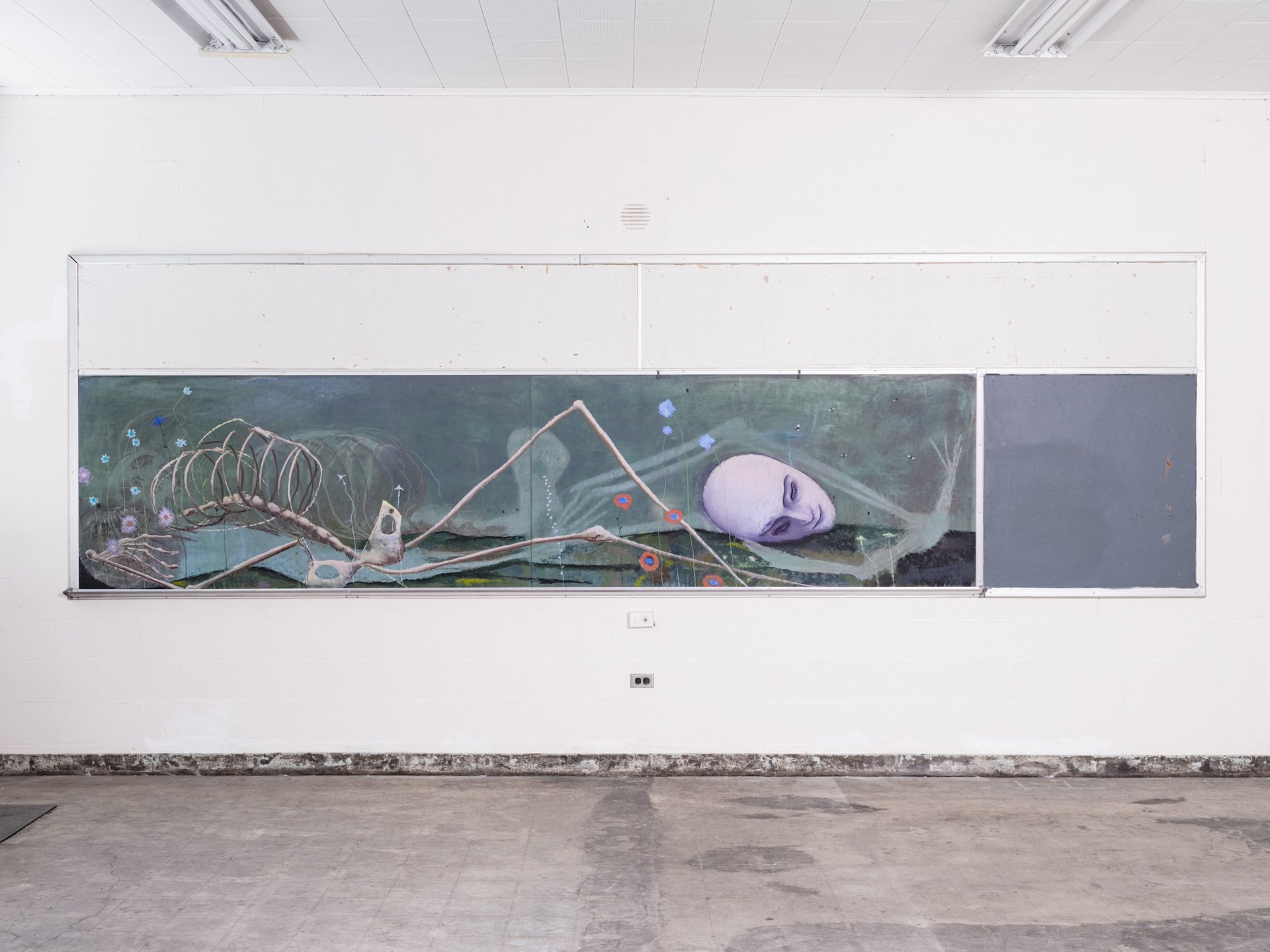 A site-specific, pastel-on-blackboard work by Sanya Kantarovsky at The Campus Photo by Yael Eban and Matthew Gamber
