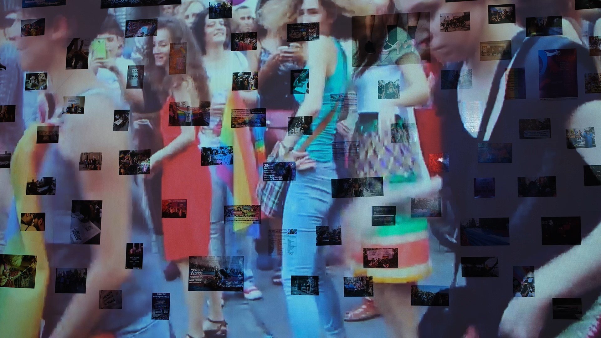 A still from video included in Turn and See Back, depicting Trans Pride marches and other forms of collective action