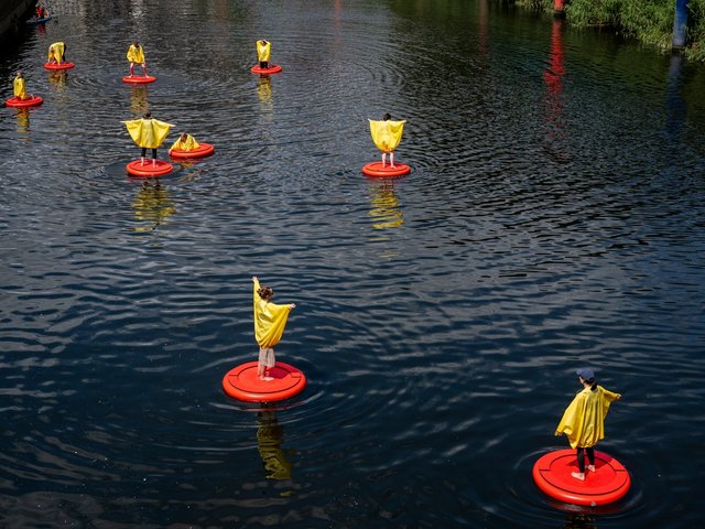Nine at a time, the participants donned billowing yellow capes (the sails) and stepped out onto red circular paddle boards (the discs) that floated down the Waterworks River for six half-hour performances on 27 July. But with no paddles to steer, they had to trust in the real choreographers of the event—the wind and the water.