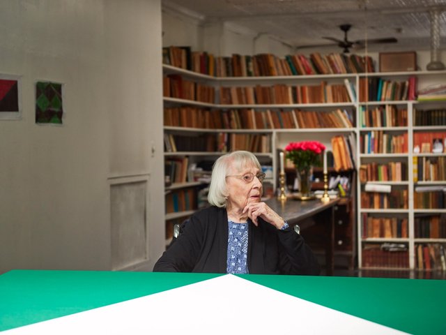 VIsitors to the Blanton sit in front of Carmen Herrera’s Verde, que te quiero verde (Green, How I Desire You Green) Photo: Casey Dunn, courtesy the Blanton Museum of Art, Austin, Texas