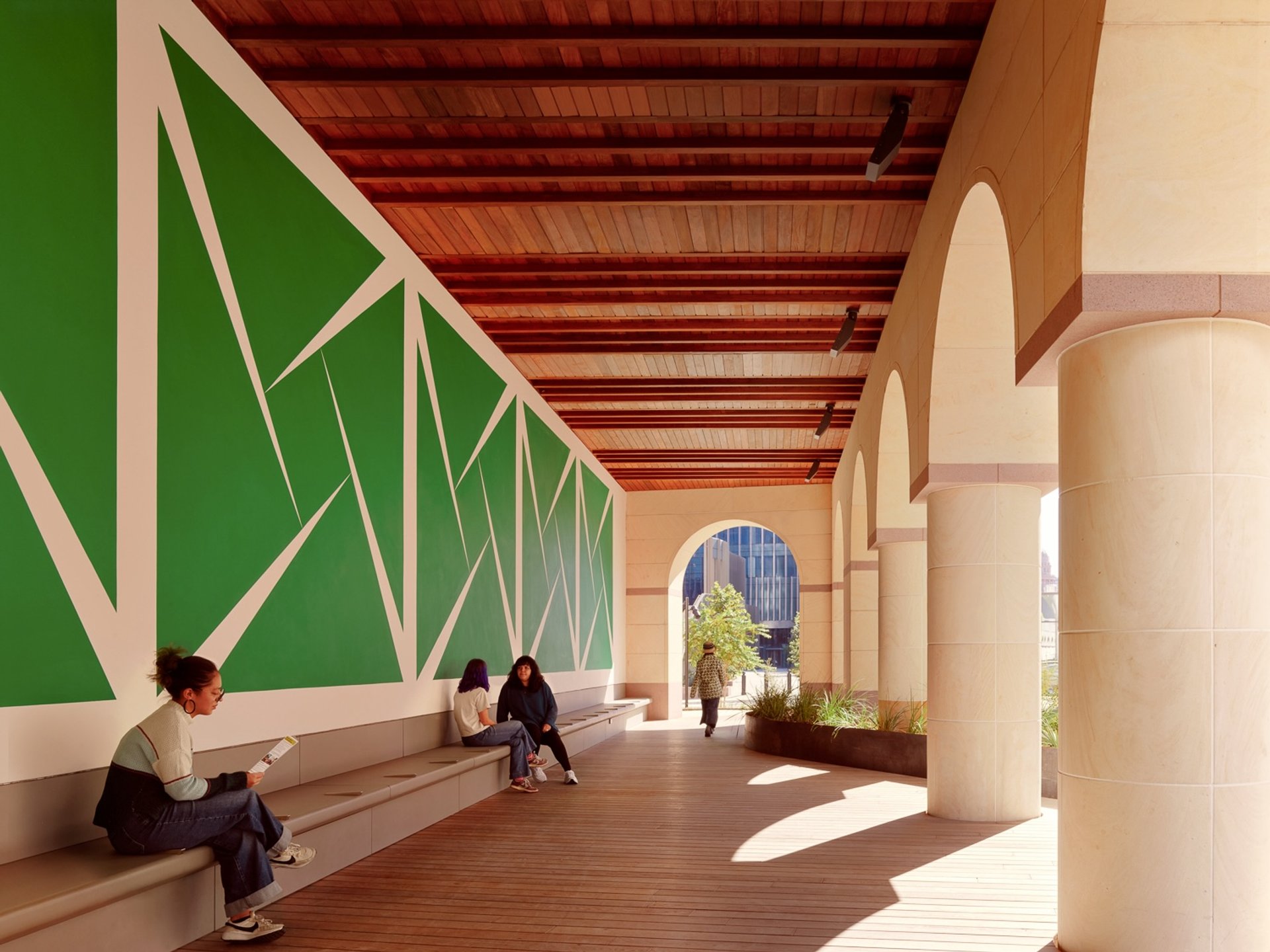 At one end of the museum’s 200,000 sq. ft footprint is Ellsworth Kelly’s Austin, evoking a secular chapel with its coloured glass windows since its installation there in 2018, and on the other are 12 new towering tulip-like shade structures by Snøhetta. Between them is a panoramic mural by the Cuban American artist Carmen Herrera—her only major public mural commission before she died in 2022 at age 106. Visitors now pass through the mural’s centre as they enter the galleries building, which faces the museum’s administration building across this revamped corridor. Called Verde, que te quiero verde (Green, How I Desire You Green), Herrera’s large-scale panels of green slashed with white recall her 1956 painting Green and White, the pinwheeling pattern now framed by the archways of the loggia that span the Blanton.