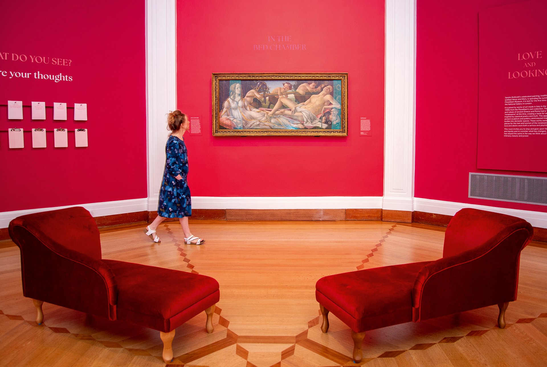 This is the first time since its acquisition in 1874 that Botticelli’s much-admired painting Venus and Mars has travelled from the National Gallery. It is on show, in the Fitzwilliam’s Octagon Gallery (painted fuchsia), with works from the Cambridge museum’s collection, including Titian’s Venus and Cupid with a lute-player (1555-65), at the heart of a show that analyses sex and power, gender and the body through Italian art of the 1400s and 1500s. The Botticelli has two red velvet chaises longues placed in front of it, matching the languid poses of the gods it depicts, to encourage long looking. Whitlum-Cooper is struck by how the Fitzwilliam curators have brought out the intimacy of a picture—normally seen in the vaulting spaces of the Sainsbury Wing of the National Gallery—that was likely connected to a wedding and that would have hung in a semi-private, semi-public bedchamber. “They’ve really leaned into that,” she says.