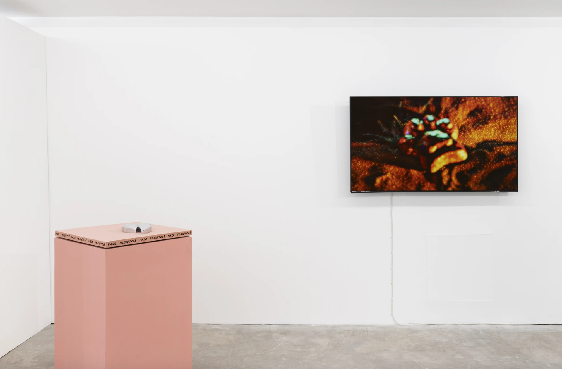 In response, Wahid has created sculptures for the show that correspond to these artefact, but are resolutely contemporary in both their style, to present a "non-linearity of time". A sculpture of a black cat is presented with a pair of silver dice tied around its neck; a figurine of a calf sits on a bright multi-coloured fur pillow, bringing them into the 21st century. Through this, Wahid hopes to vivify artefacts that were stolen from their original locations and are now displayed in a manner entirely divorced from their original context, or simply stored away from public view.