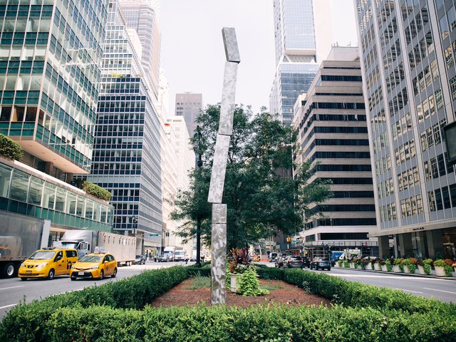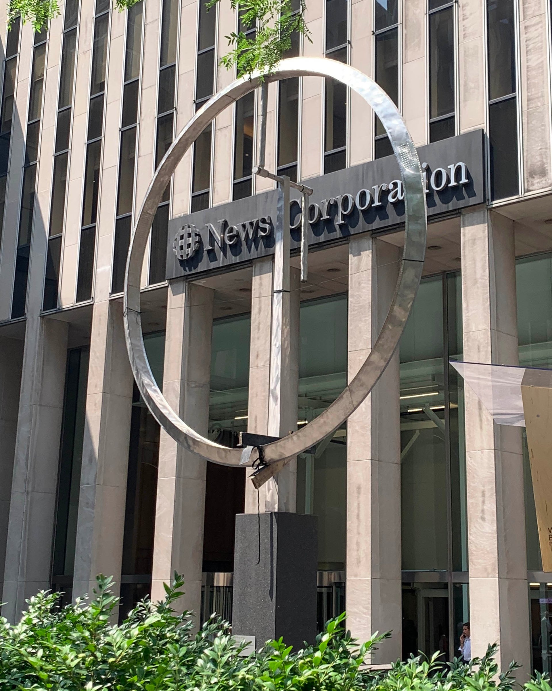 Rickey’s sculpture stands in the plaza facing the global headquarters of News Corp, conservative media mogul Rupert Murdoch’s company. Among other facilities, the building houses the main studios for Fox News as well as offices for the New York Post and other News Corp properties.
