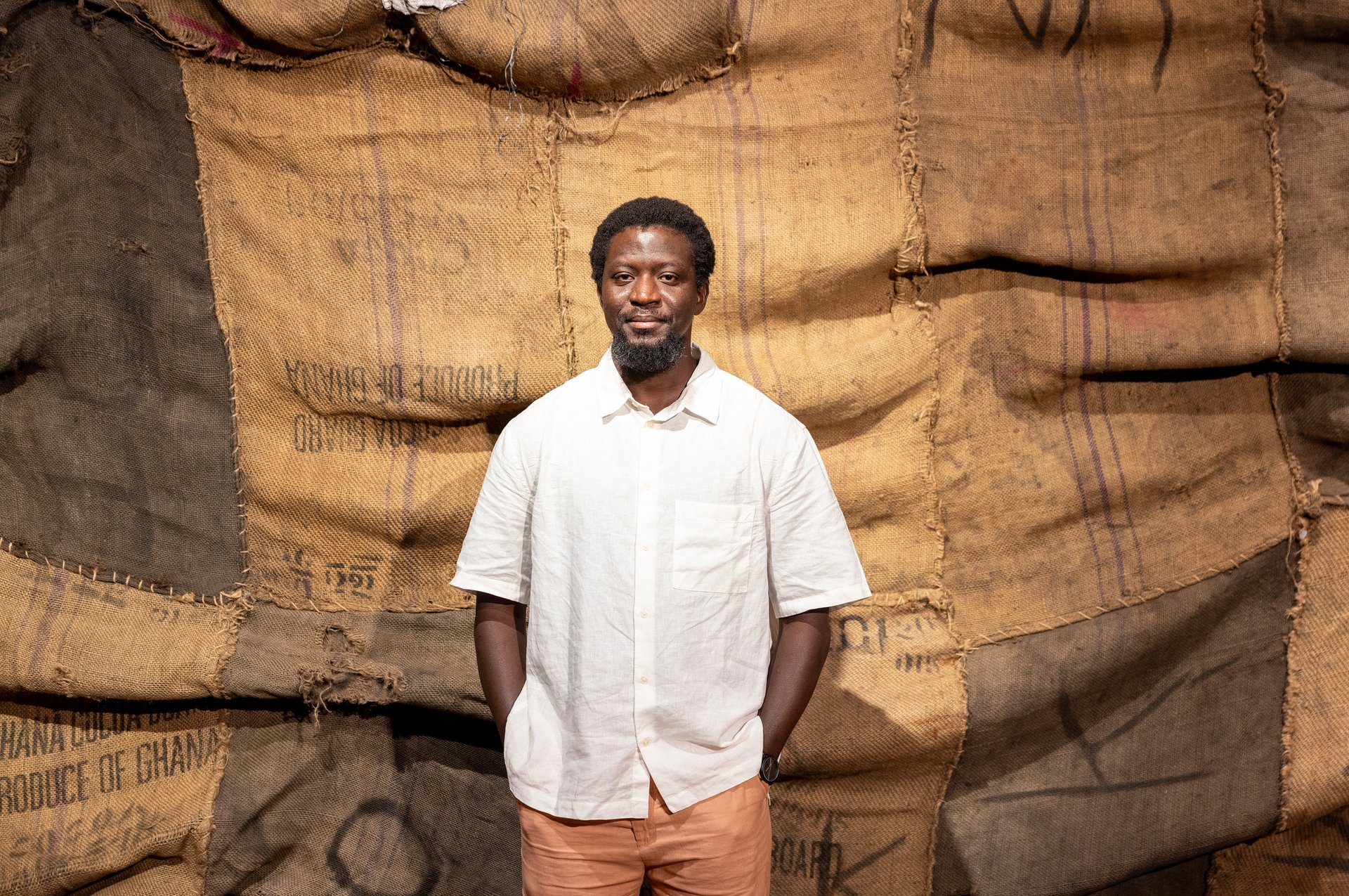 Ibrahim Mahama with his work, Untitled (2013) at Bonhams, New Bond Street, London. Courtesy of Bonhams
