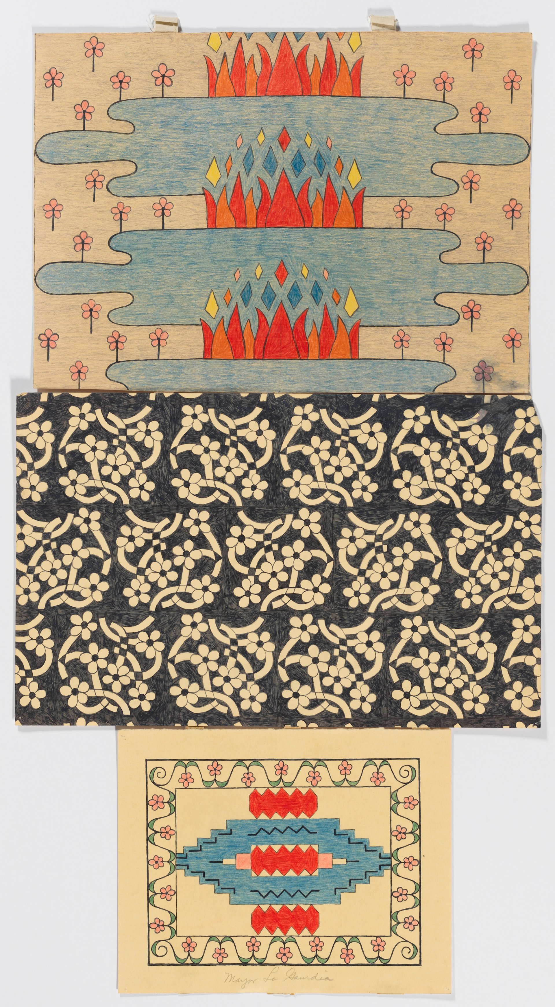 Sully, like her great-grandfather the portraitist, was enraptured with celebrity—a world she was detached from but observed via magazines like Life and Good Housekeeping. Some of her works, however, suggest that she also took inspiration from real-life experiences, like living in New York. In this “personality print”, she represents the New York politician Fiorello La Guardia, adorning his three panels with floral patterns in reference to the meaning of his first name in Italian, “little flower”.