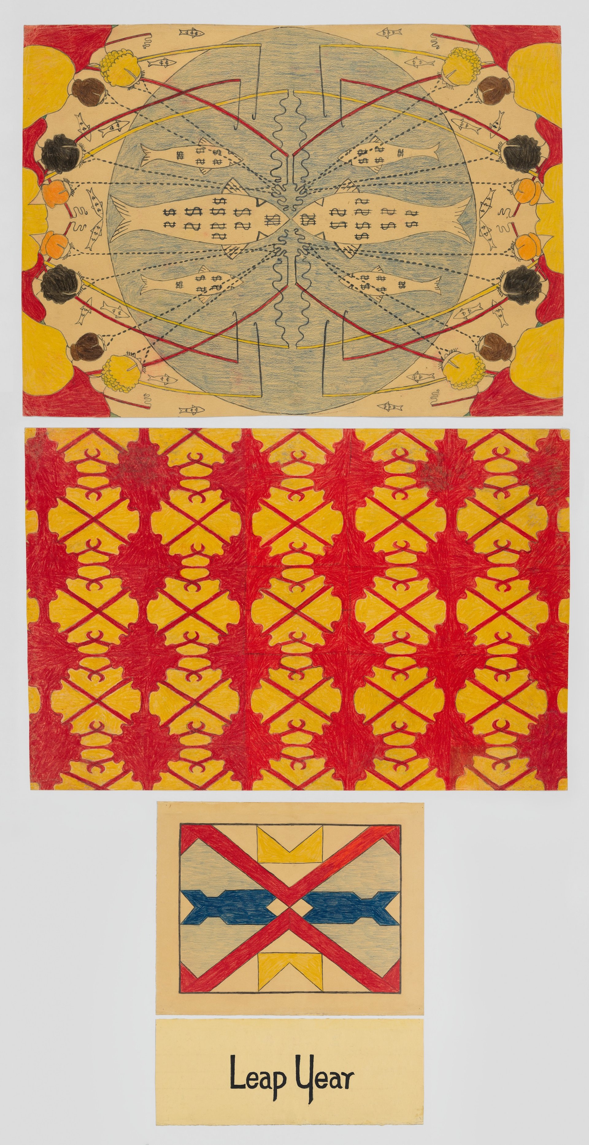 Many of Sully’s works take a unique approach to perspective, oftentimes presenting subjects from an aerial view. In this one, Sully draws women wielding fishing poles, each attempting to catch the biggest or “richest” fish and overlooking the smaller, more accessible ones branded with fewer dollar signs. In the subsequent panels, she abstracts the image with kaleidoscopic effects. The work encompasses humour, social critique and romantic relationships—a theme also visible in pieces like Lunt & Fontanne, a floral work that references a famed Broadway couple believed to have had a lavender marriage.