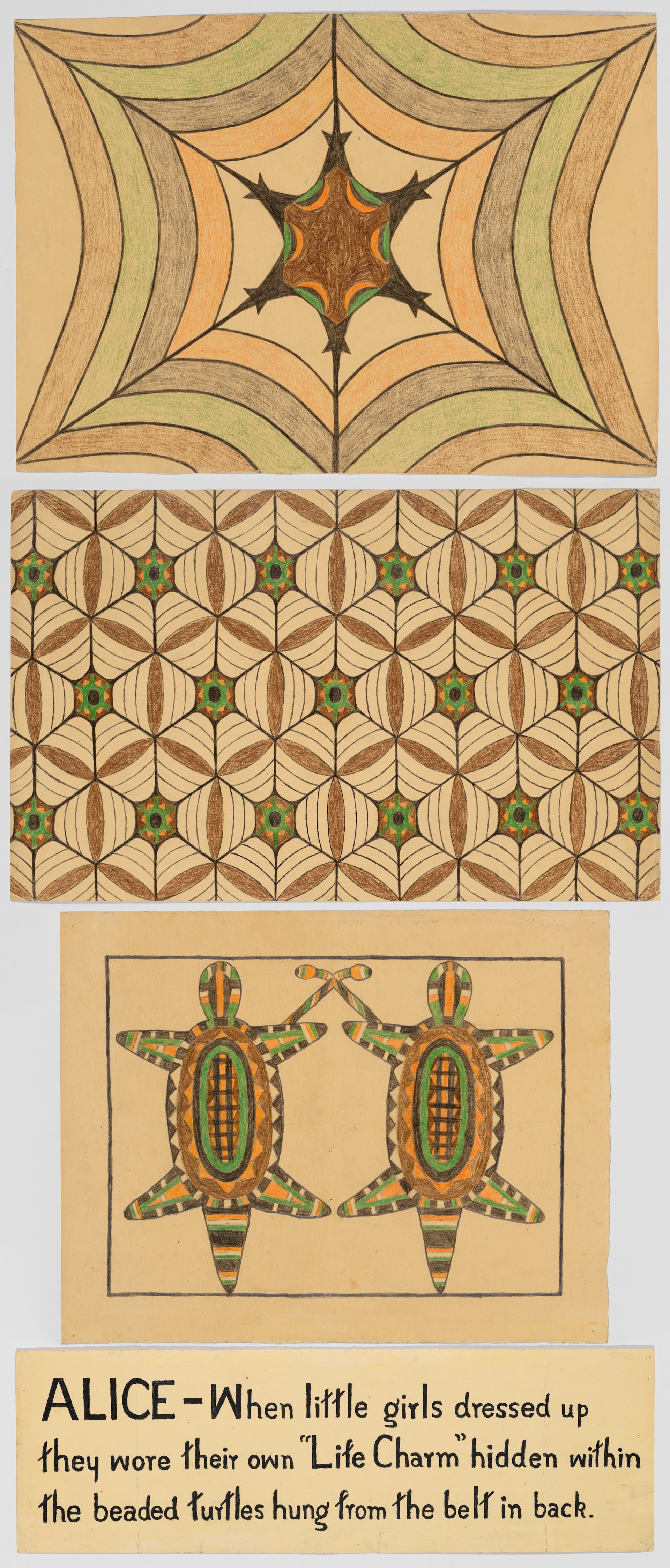 A centrepiece of the Met’s exhibition, this work features a series of turtles representing young girls. When a Dakota child is born, their umbilical cord is traditionally placed inside an amulet, with girls receiving containers shaped like turtles and boys getting lizards. The amulet could be worn on a dress, belt or sash, symbolising that the child will never become disconnected from their community or family. In this work, the two turtles tethered together by their umbilical cords perhaps reference Sully’s close relationship with her sister, the earliest and only known proponent of Sully’s art practice in the artist’s lifetime.