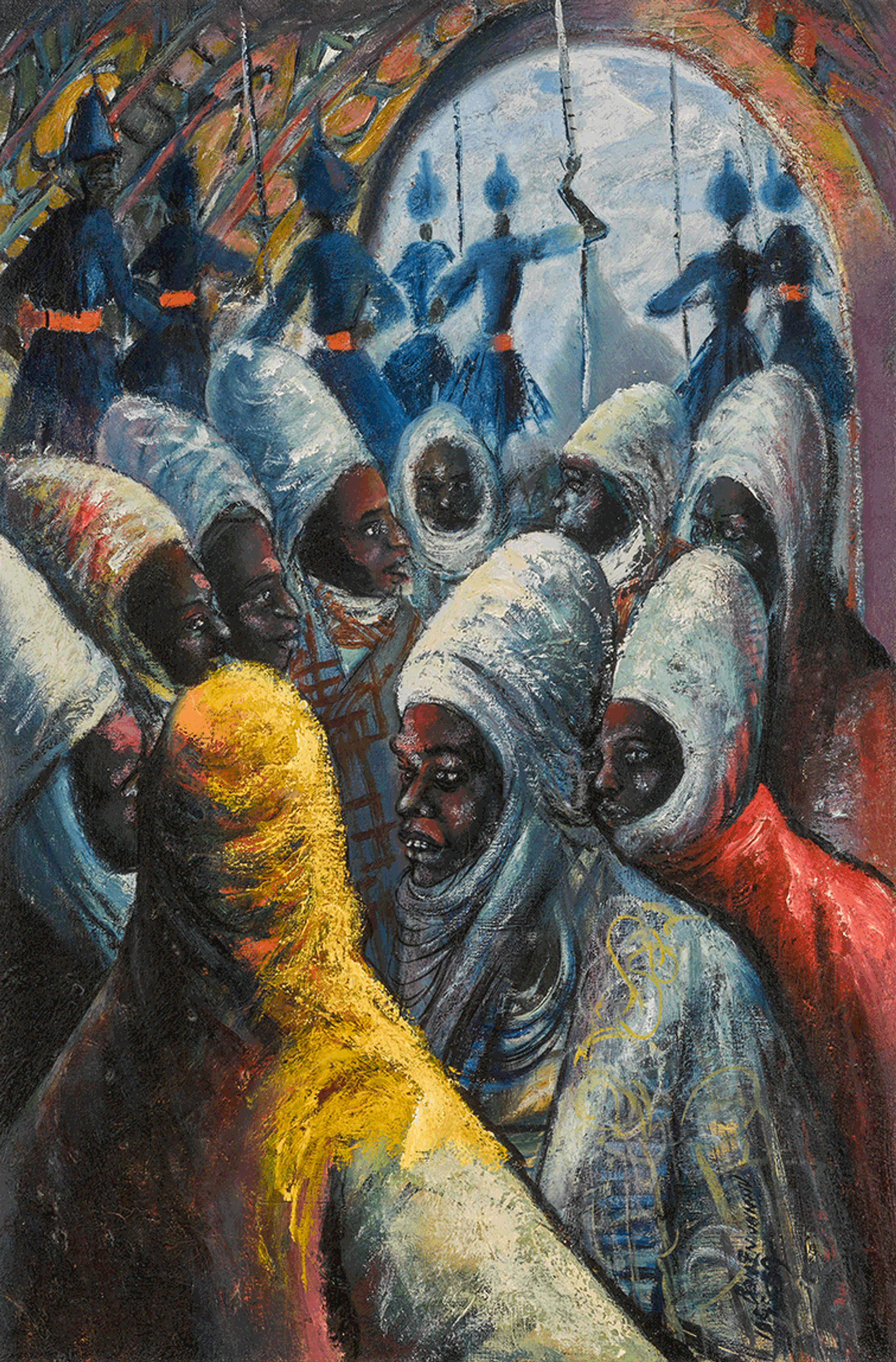 This painting by the Nigerian artist Ben Enwonwu was rediscovered after being bought by an art historian working at a Lisbon gallery. It was one of three works the gallery acquired from a local antiquarian. This newly discovered Enwonwu piece had remained anonymous since the 1990s, during which time it was part of a private Belgian collection. Around a year after acquiring the lot, the art historian at the gallery conducted a historical and stylistic analysis, according to Sotheby’s. This work was begun during the artist’s studies at The Slade, and completed on the eve of Nigerian Independence. It depicts the Emir of Kano, one of the most powerful emirates in Northern Nigeria, in council with his advisers and surrounded by colonial guards.