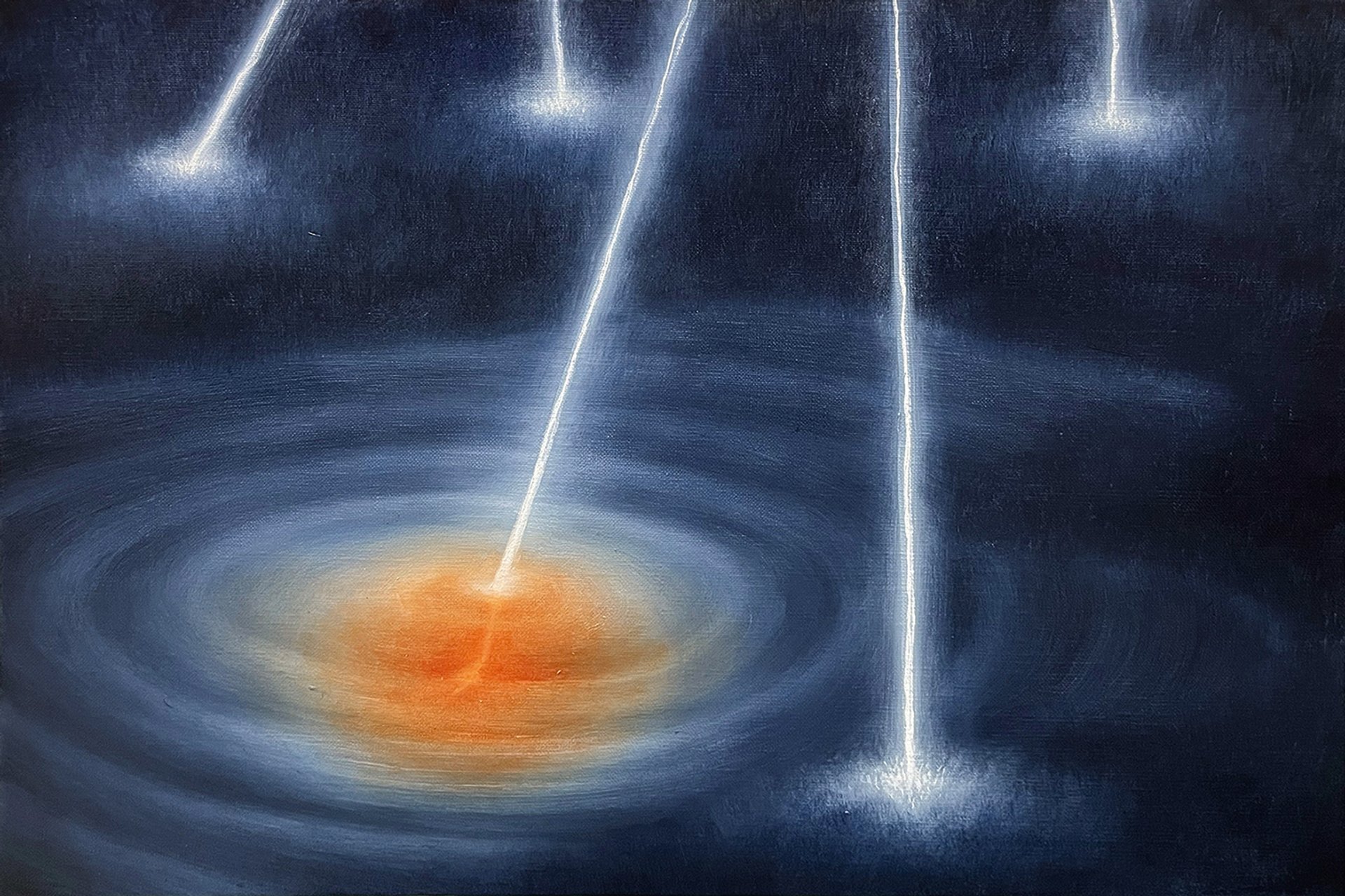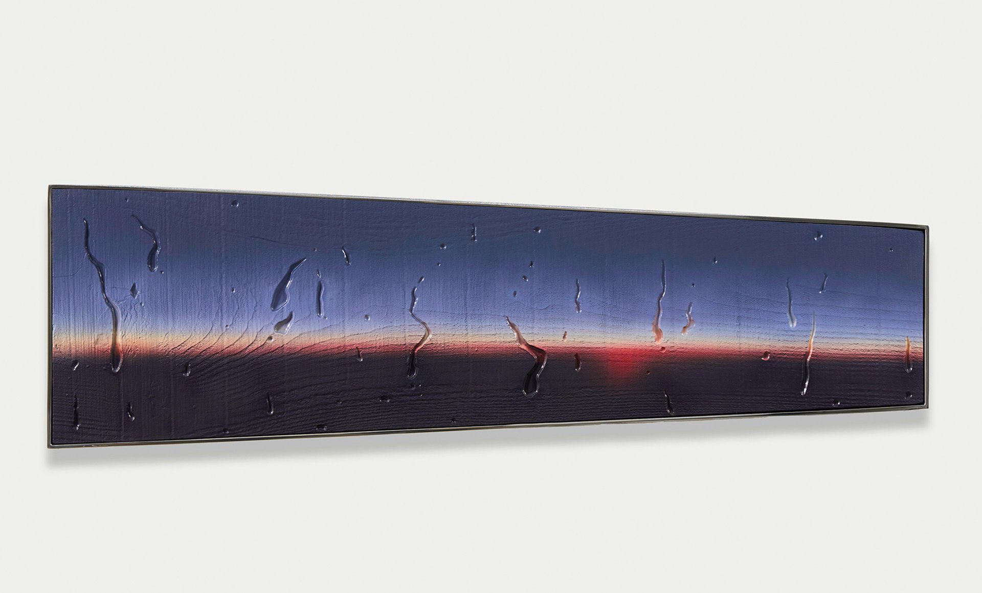 Supawich Weesapen’s extraordinarily painted canvases almost seem backlit, as they glow like the screens we are constantly faced with. Even his experience of the sublime comes from scrolling through endless images on his mobile. In this installation, he looks to the contemporary sublime that is science fiction, with his abstractions referring to otherworldly depths.