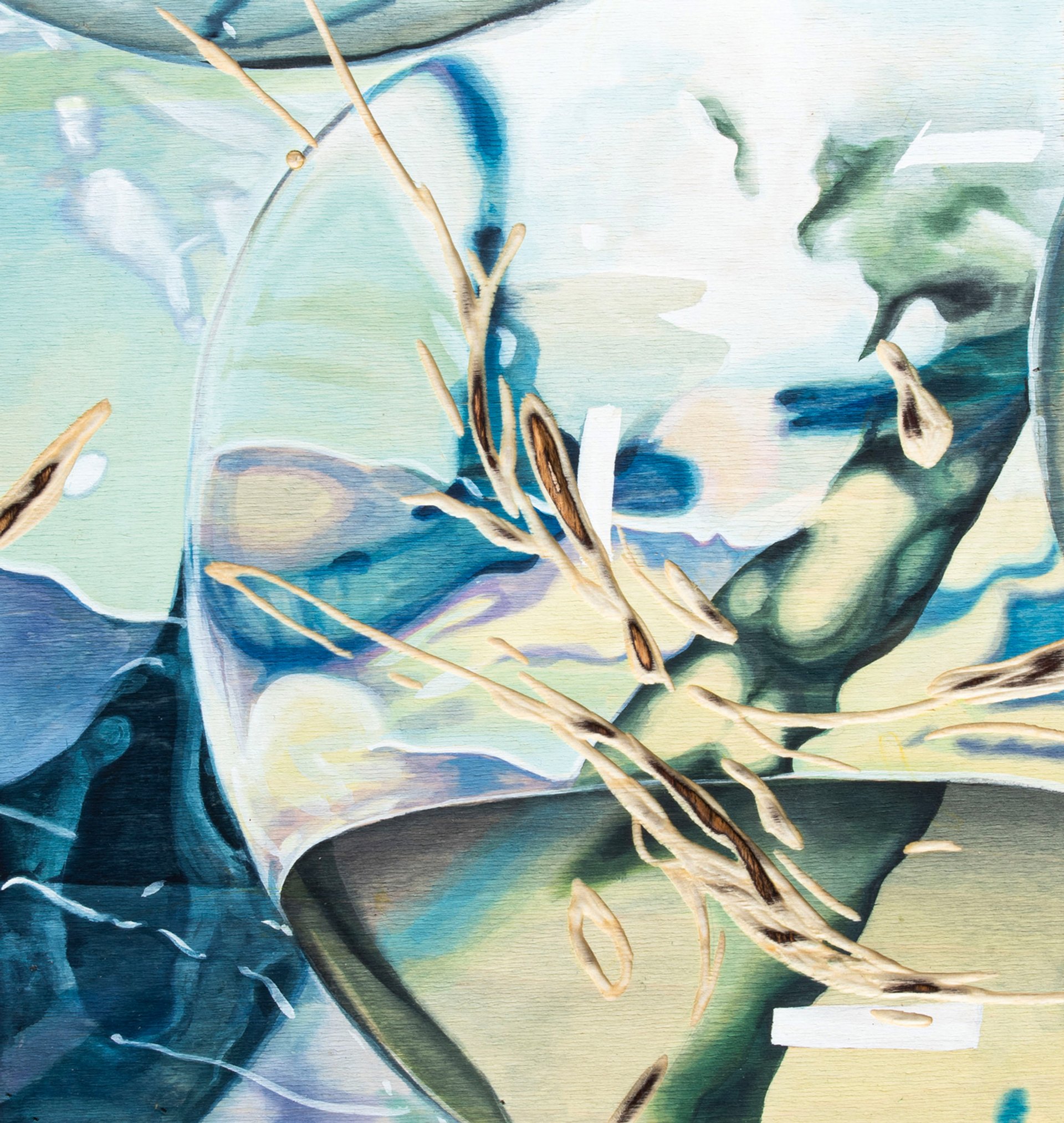 The works of Jonghwan Lee are experiments in painting materials and their capacity to create worlds in which viewers can lose themselves. His watercolours on wood panels are “scarred” to reveal the panels’ rings and knots. In a kind of reverse trompe l’oeil, these gestural swathes carved on to the panels blend in with the pastel wash.