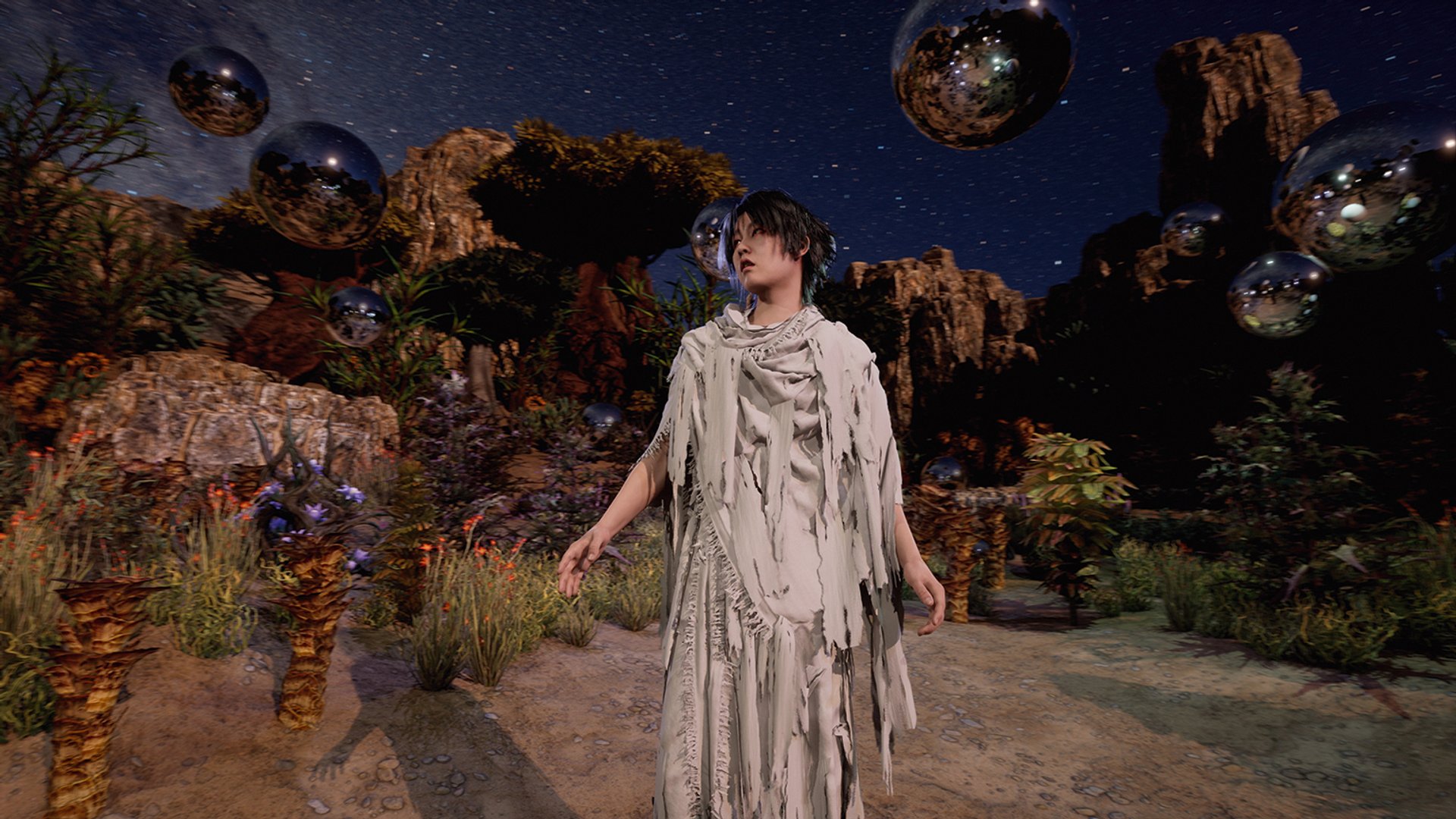 This installation by Taiki Sakpisit reaches beyond the confines of the planet towards a hopeful future, but his hopes are not extraterrestrial. Instead, he searches closer to home. Connections—familial, physical, spiritual and psychological—are what his protagonist aspires to. The filmmaker’s video installation suggests that sound is the key that allows us to connect, physically, even to those who are not there.
