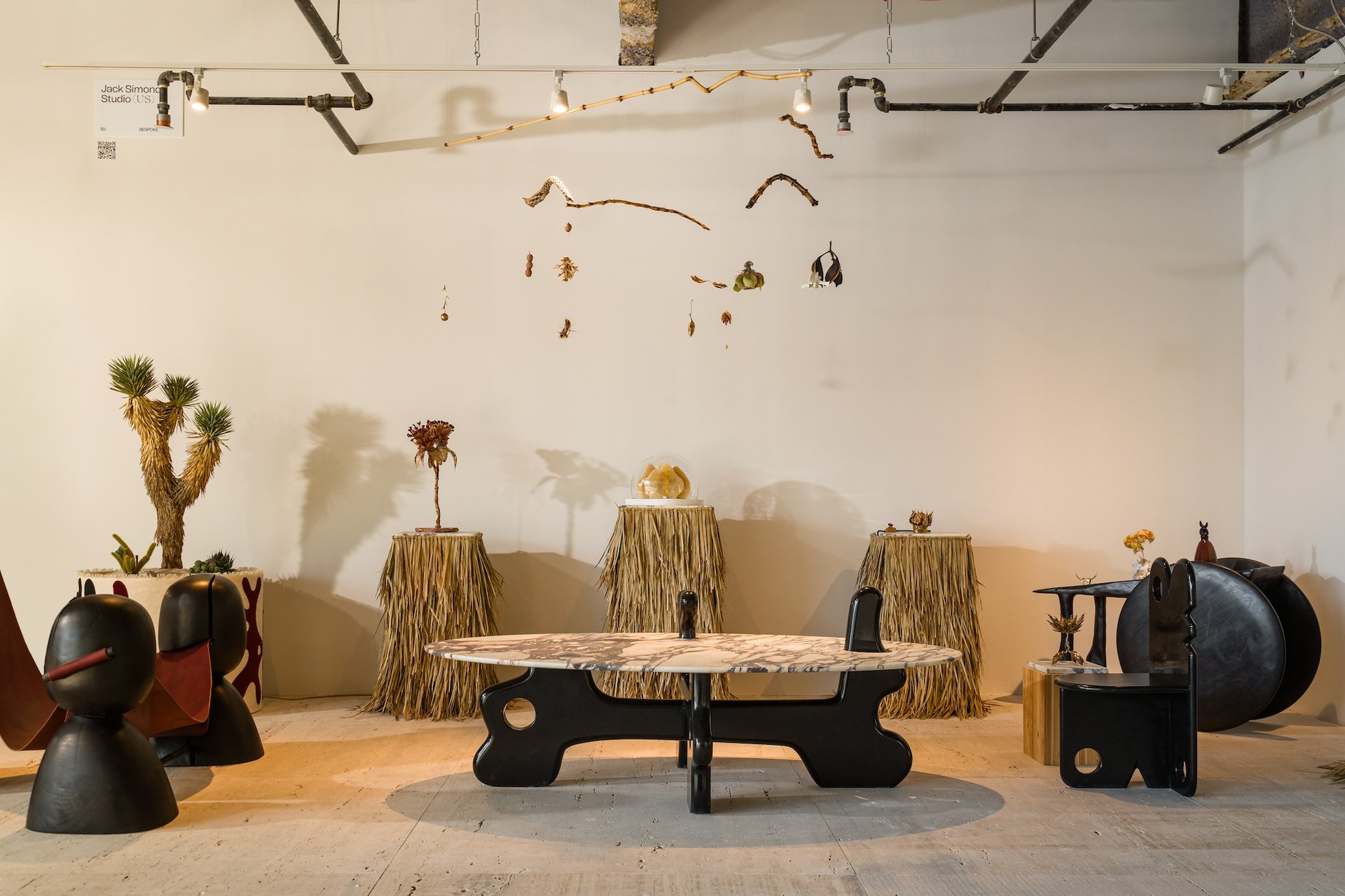Other notable presentations include a stand of seats in wide-ranging styles from the New York-based Lyle Gallery, a pair of elemental screens and a richly detailed wooden bench depicting a gharial (a type of crocodile) by the Bangalore-based design studio The Vernacular Modern, a series of lamps made with beeswax and flowers by New York’s Jack Simonds Studio and a vibrant, candy-hued stand from New York-based Tuleste Factory.